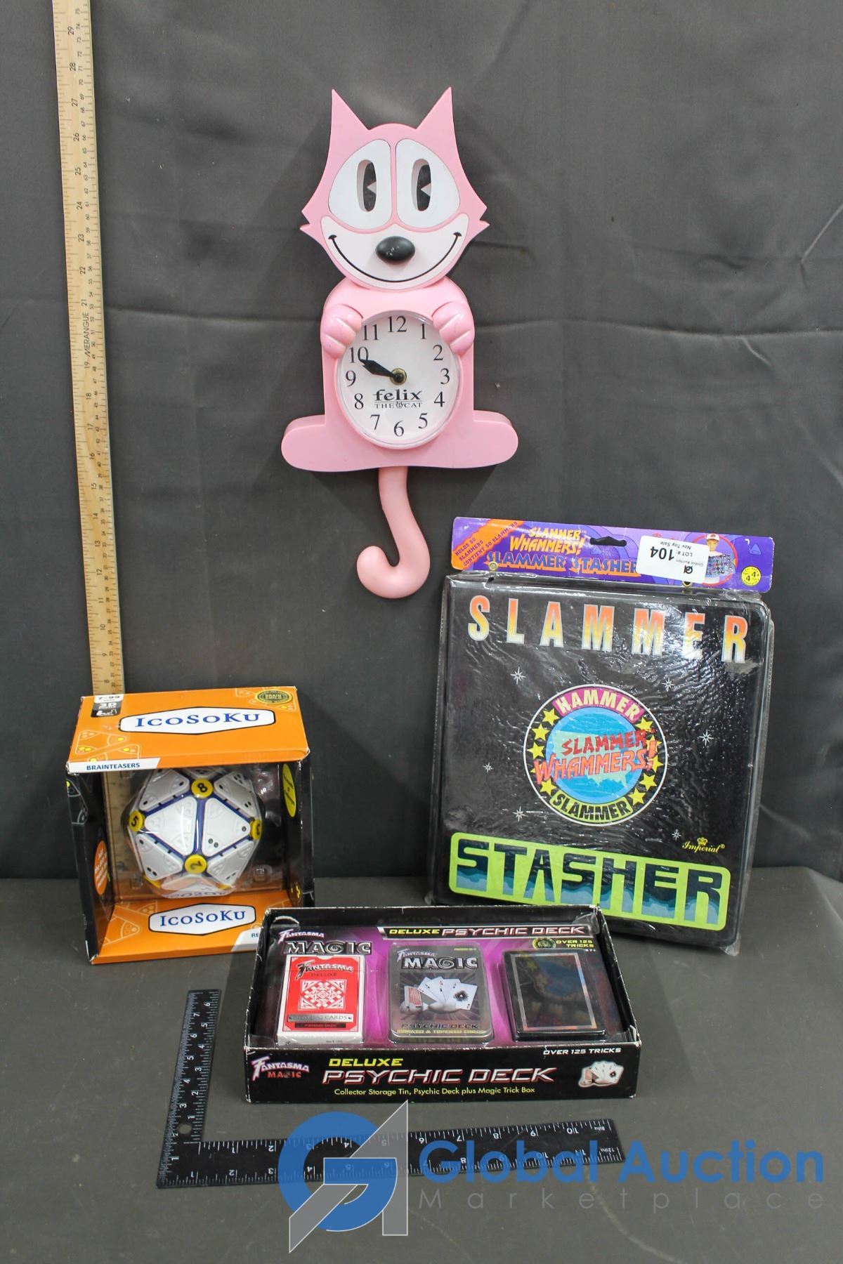 Lot 104 Slammer Stasher, Icosoku, Pink Felix The Cat Clock & Psychic Deck