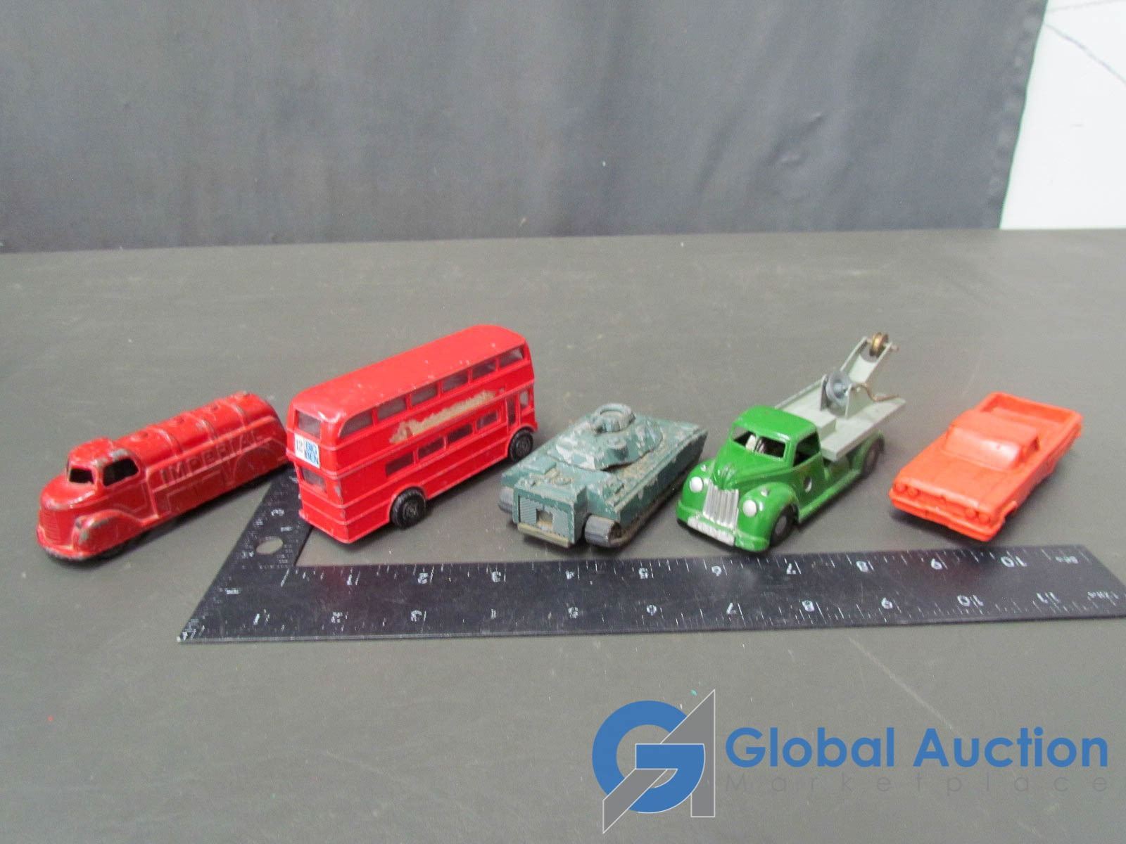Includes 60's El Camino; Imperial Tanker; Friction Drive Tow Truck; M. Persaude Double Decker Bus & Tank