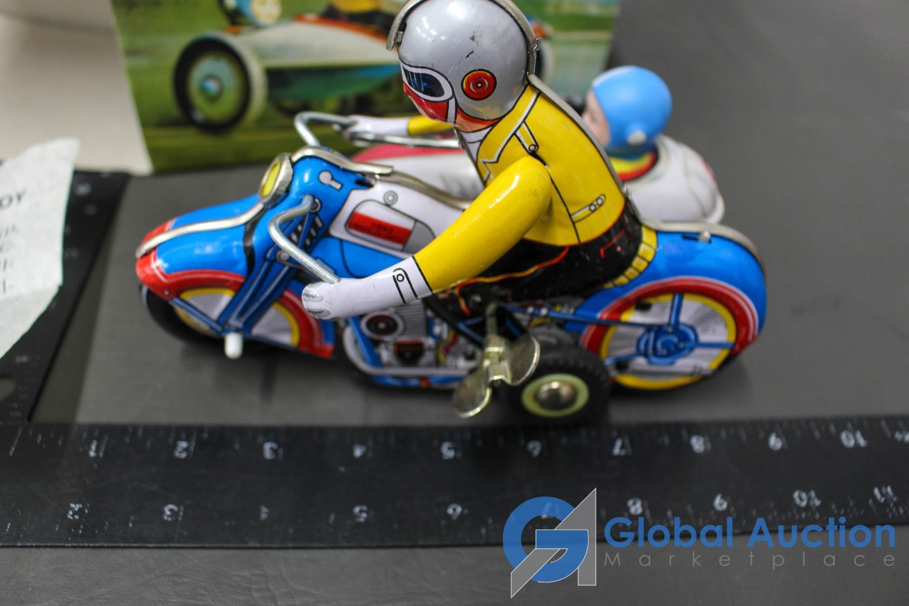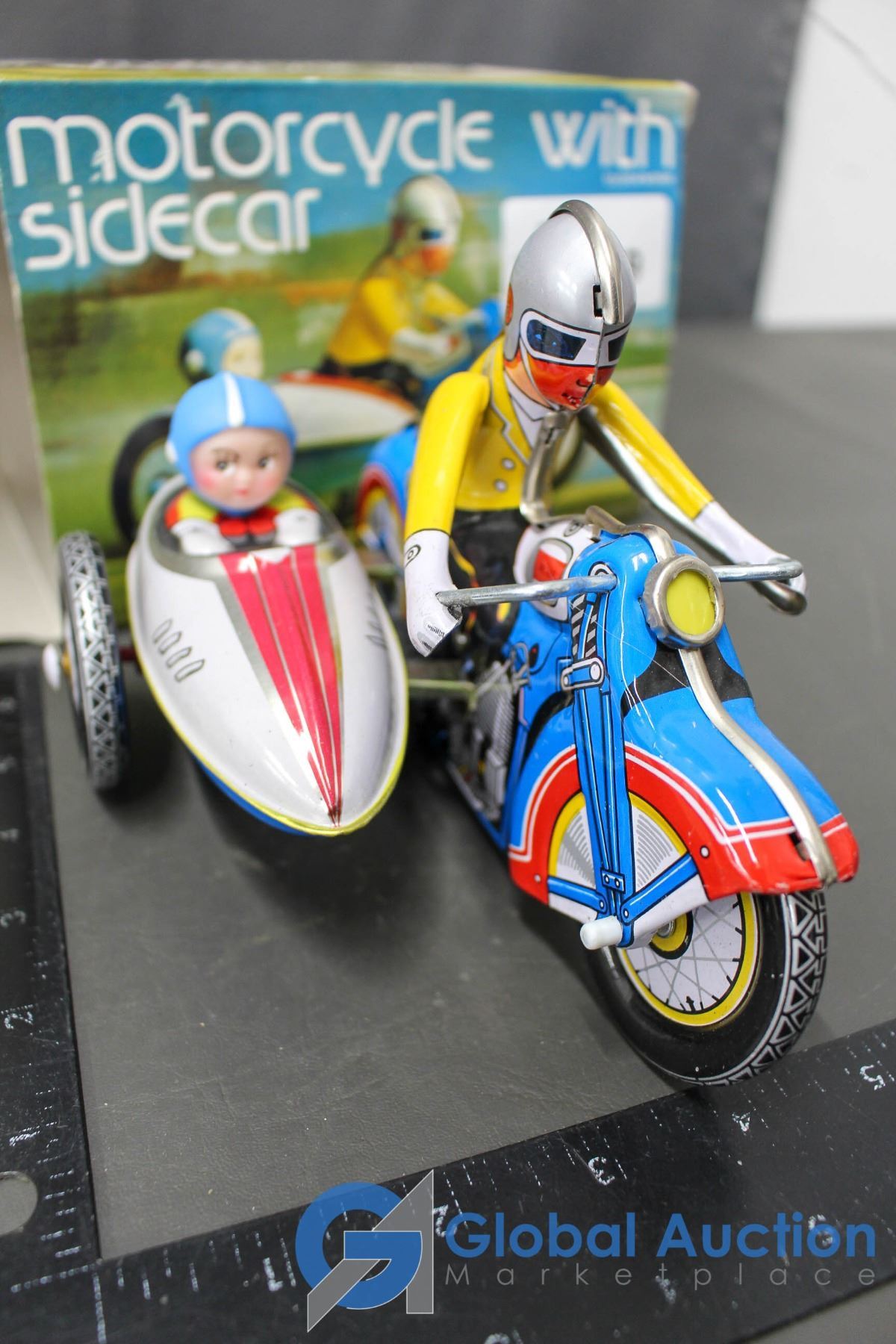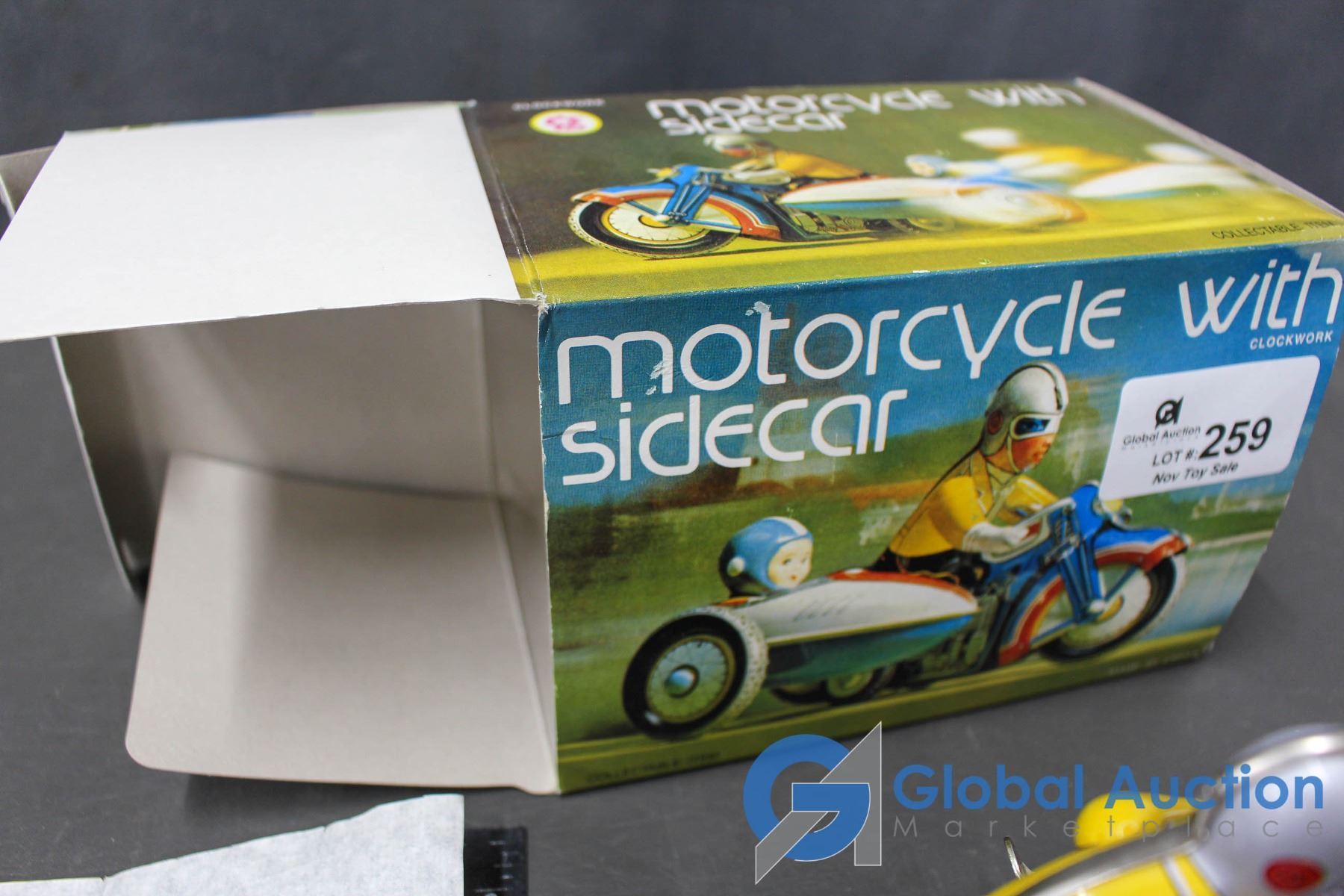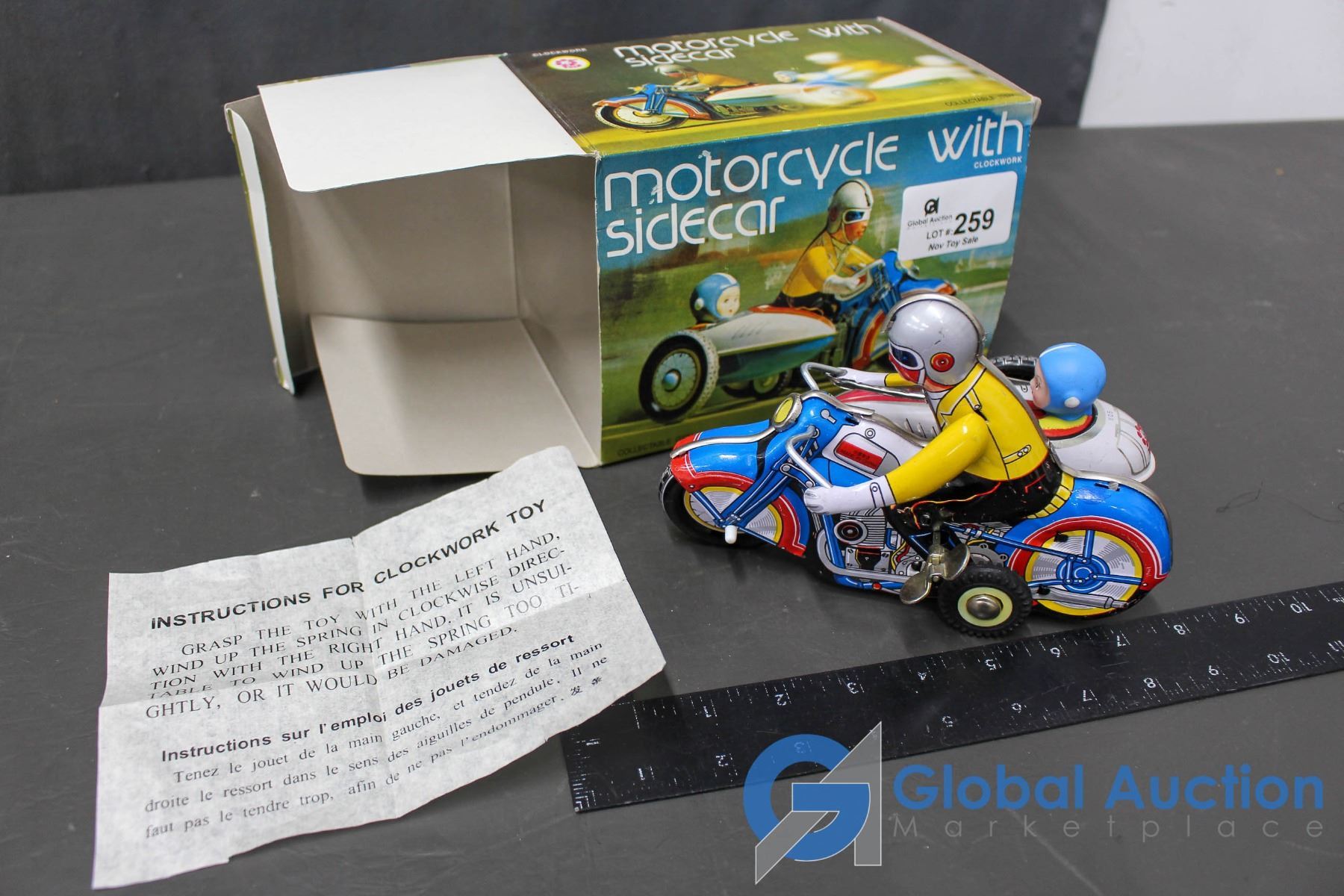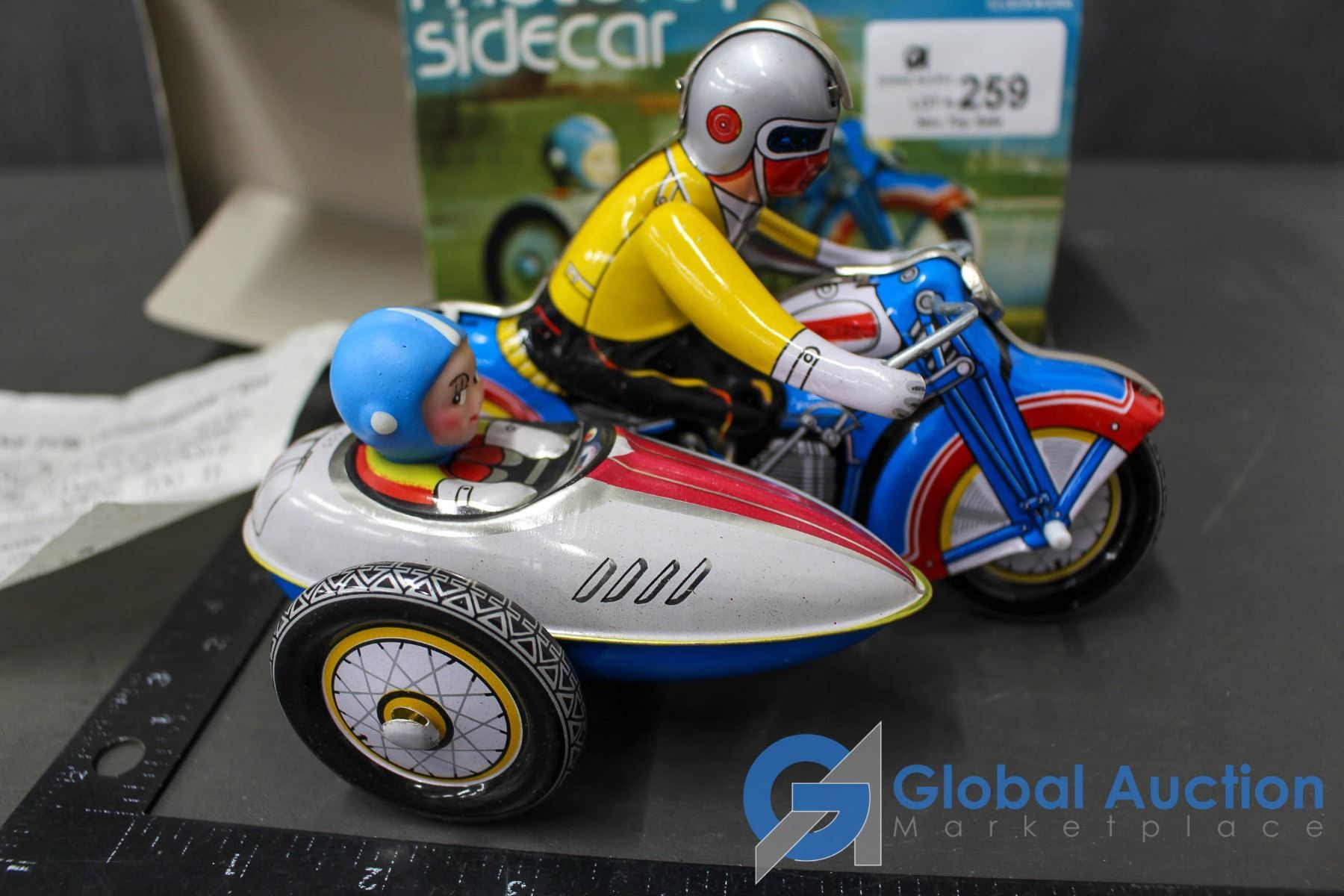 Lot 259 Tin Clockwork Motorcycle with Side Car in Box