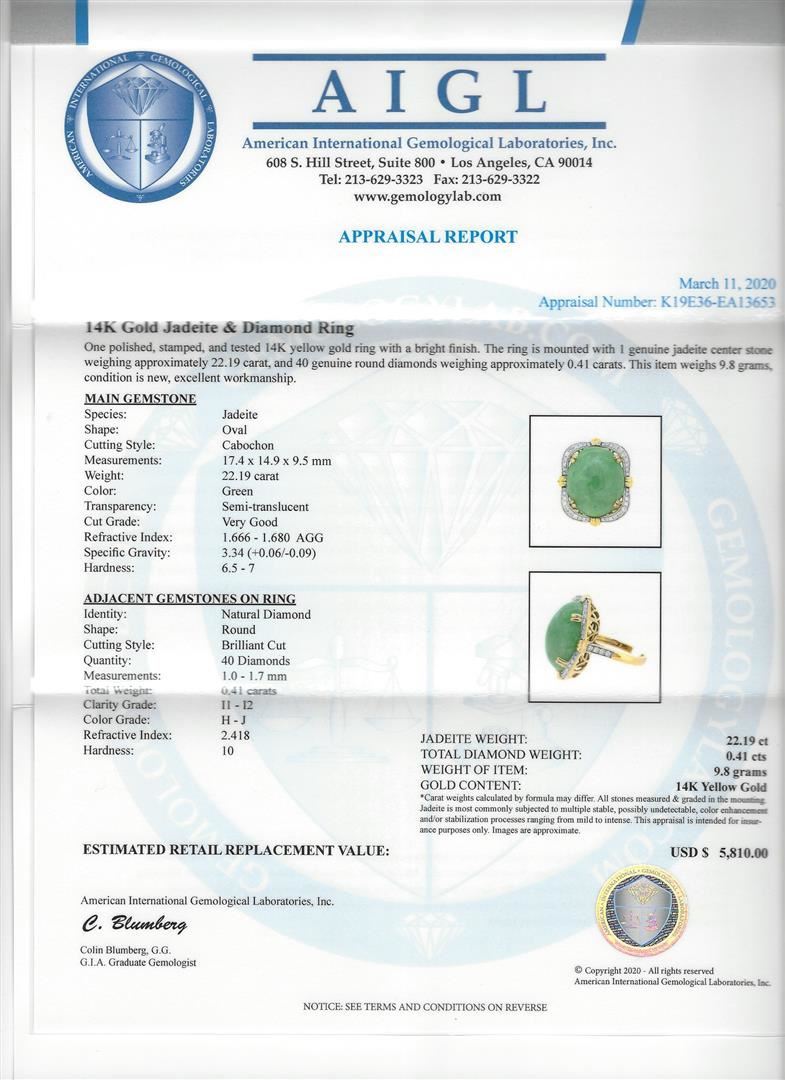 One 22.19ct Jadeite and Diamond Ring - 14KT Yellow Gold. AIG certified. See Appraisal for more details. AIG Appraised.