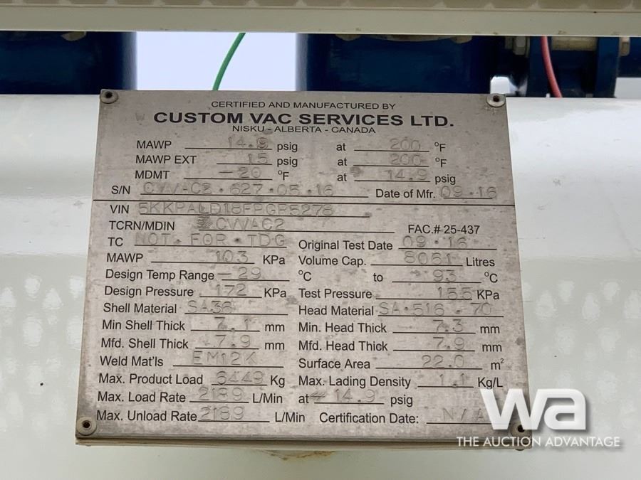 AXLES: TRIDEM COLOR: WHITE/BLUE ENG BRAKE, TRIP DIFF LOCK, DBL FRAME, AIRLINER A/R SUSP, 20000 LB FRT, RZ69166RSRS REARS, 272 IN. WB, 2015 CUSTOM VAC 8061 L