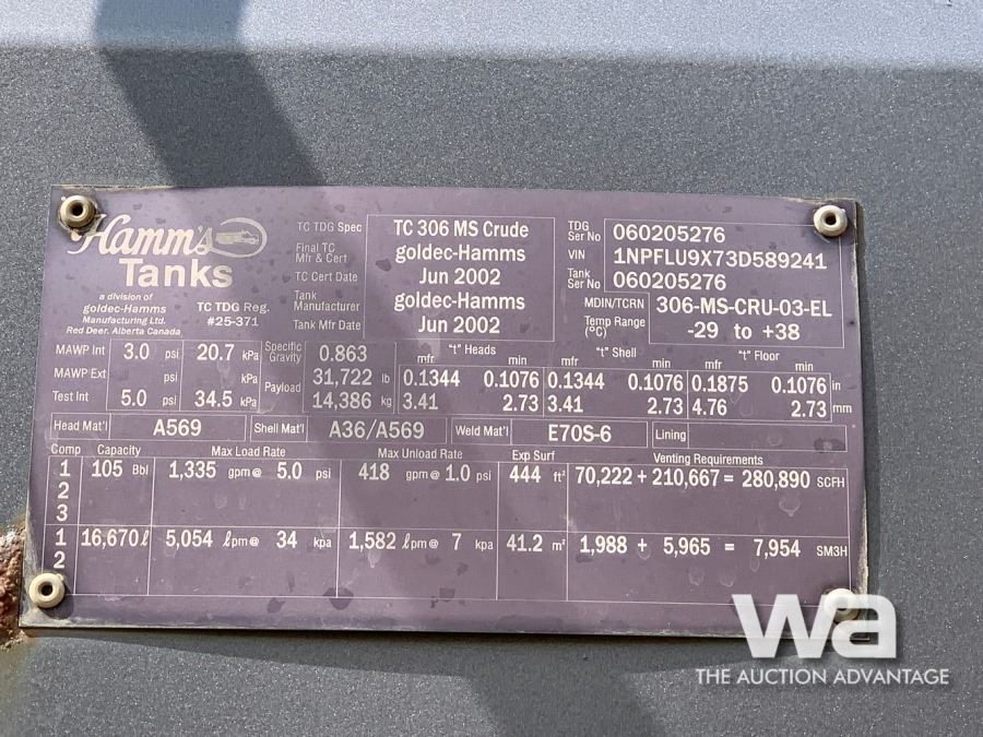 AXLES: T/A COLOR: GREY HAMMS 16,670 LITRE TANK, TC 306, 1 COMP'T VIN: 1NPFLU9X73D589241 *AB REGISTERED