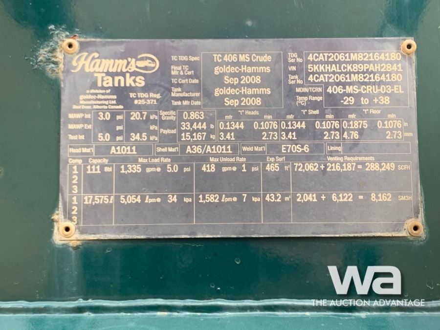 AXLES: T/A COLOR: BLACK ENG BRAKE, DBL DIFF LOCK, A/R SUSP, 18740 LB FRT, RT46164P REARS, 260 IN. WB, 2008 HAMMS 17,575 L TANK, TC 406 CODE, 4 IN. HYD PUMP,