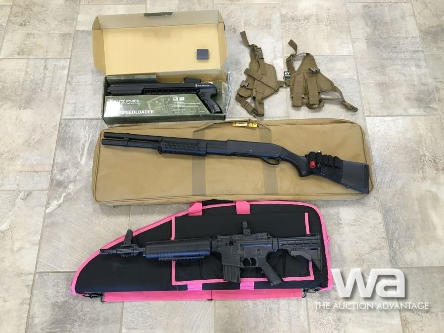 C/W: (3) TEN ROUND CLIPS, SHELL HOLDER, CASE FOR EACH GUN, & SHOULDER HOLSTER FOR HAND GUN, SL14 SPEED LOADER: READY FOR MOST M4/M16 AEG MID-CAP MAGAZINES OUT OF THE BOX, 6mm