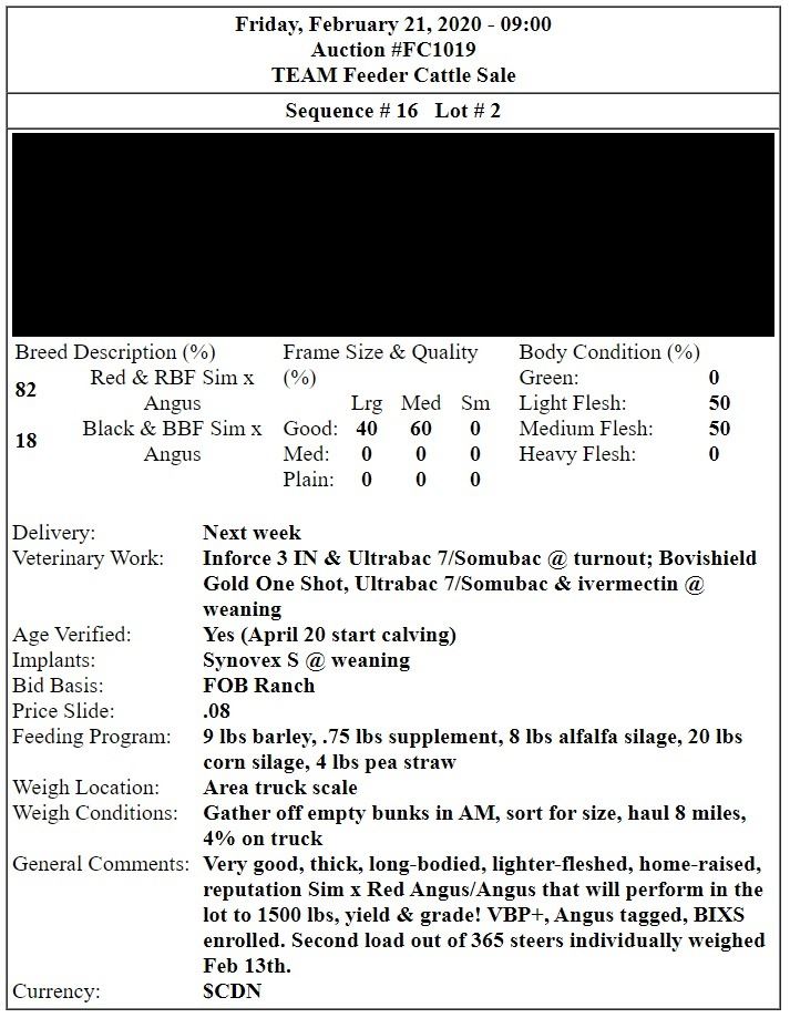 Very good, thick, long-bodied, lighter-fleshed, home-raised, reputation Sim x Red Angus/Angus that will perform in the lot to 1500 lbs, yield & grade! VBP+, Angus tagged, BIXS enrolled. Second load out of 365 steers individually weighed Feb 13th.