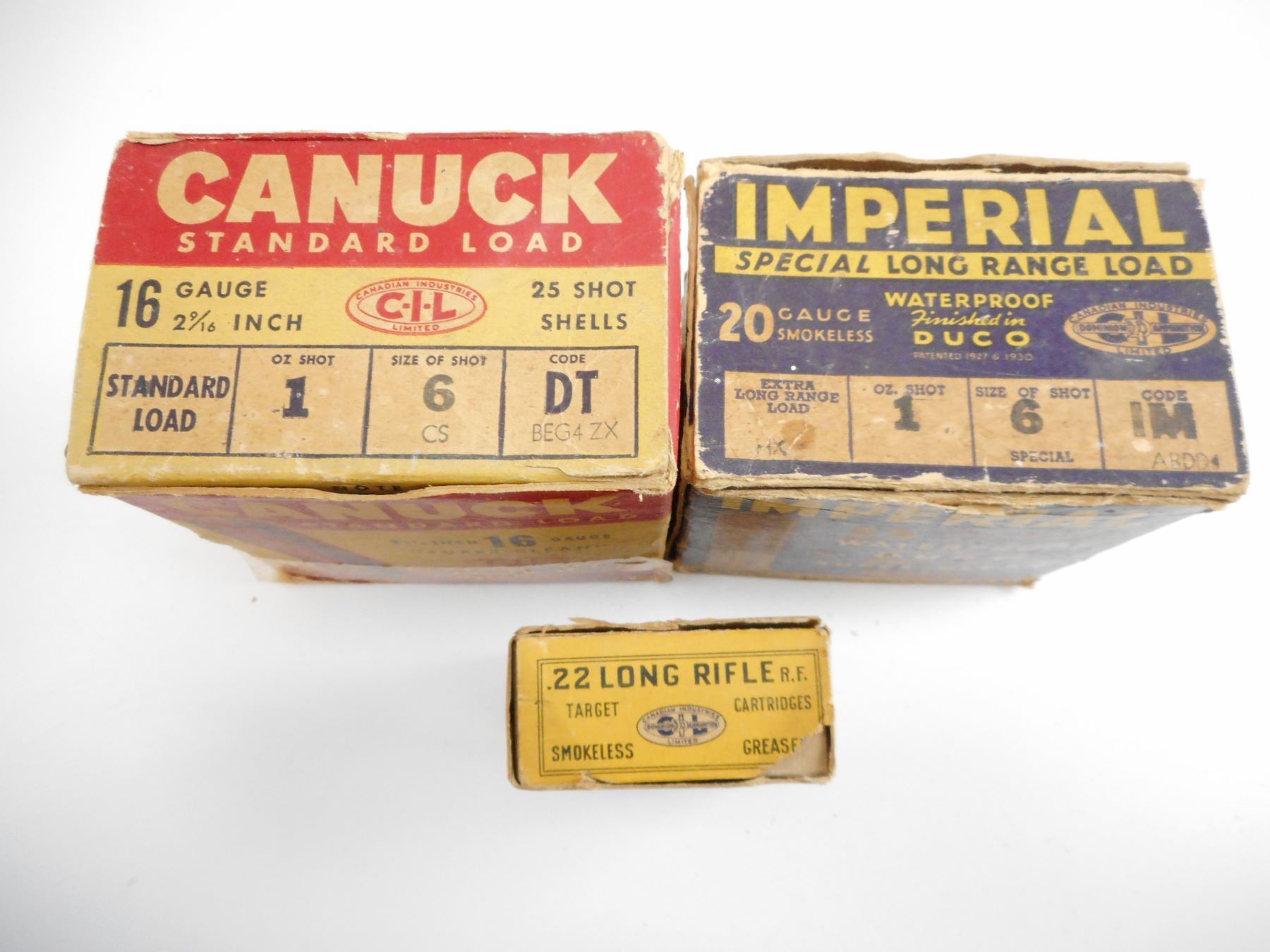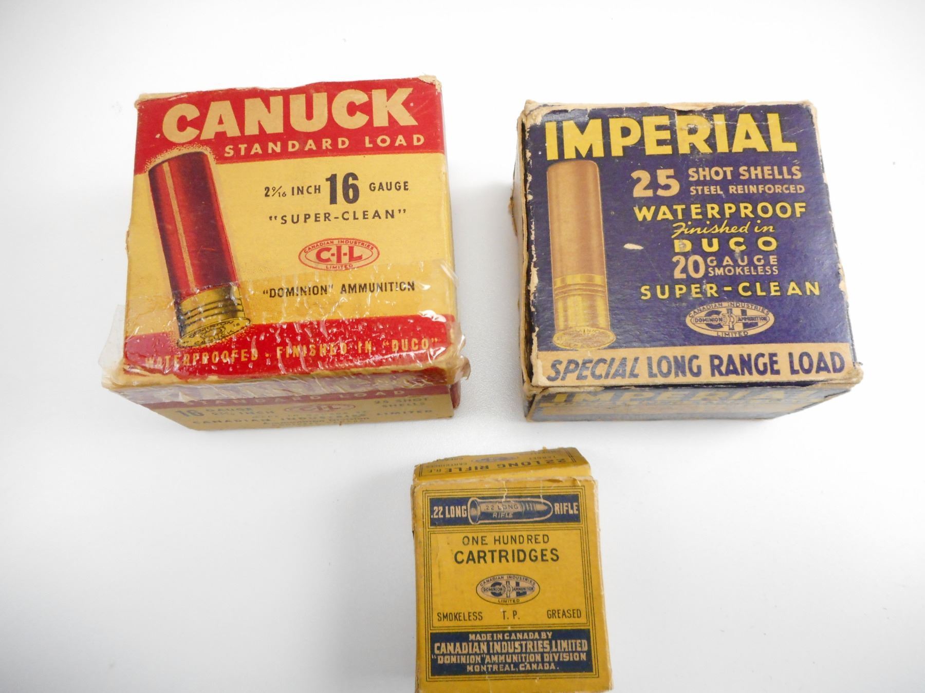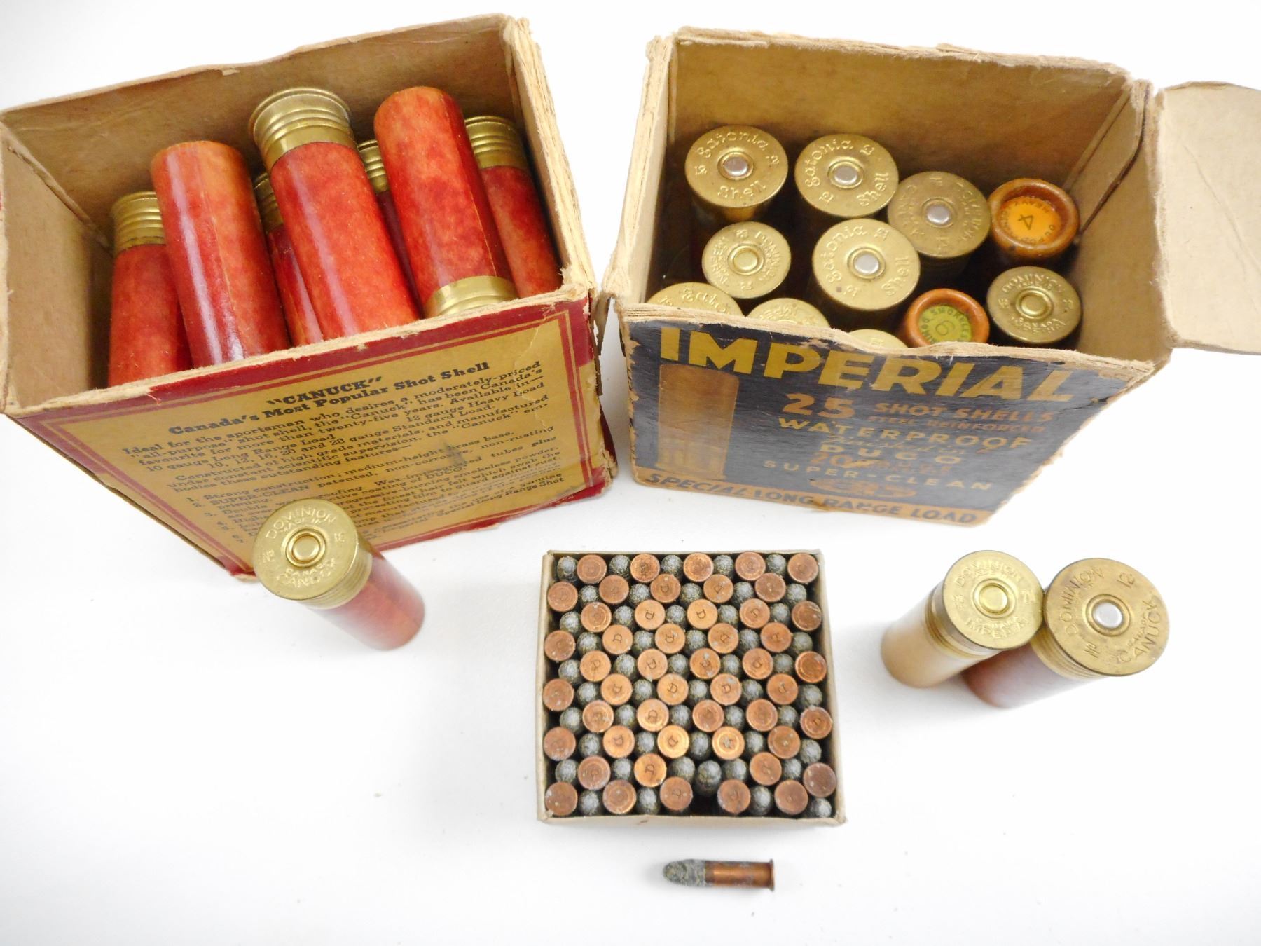 ASSORTED LOT INCLUDING .22 LR DOMINION AMMO, SHOT SHELLS, 20 GA, 16 GA, 12 GA, IMPERIAL,CANUCK, IN DAMAGED COLLECTABLE BOXES , 37 SHOT SHELLS, 50 RNDS .22 AMMO