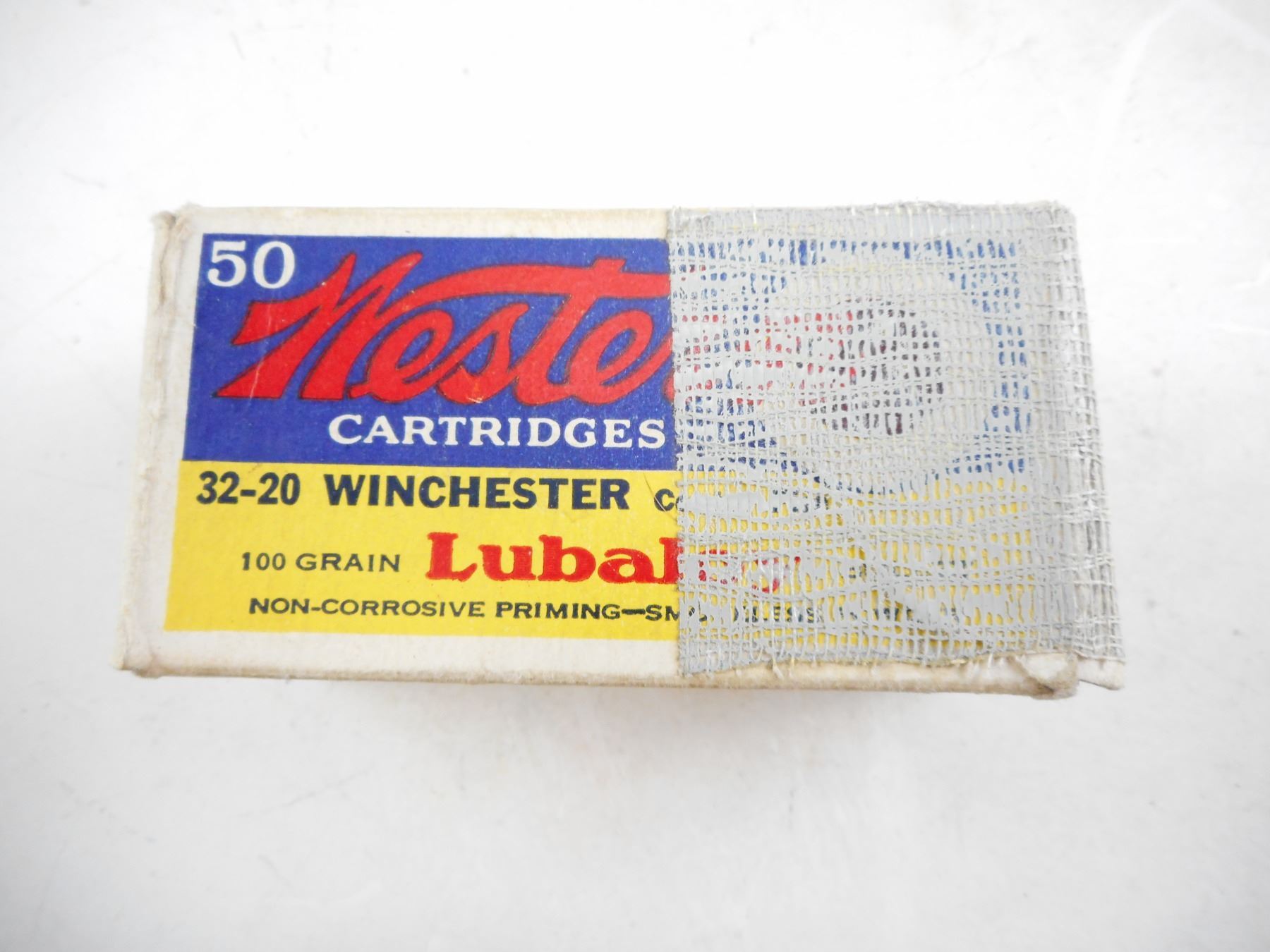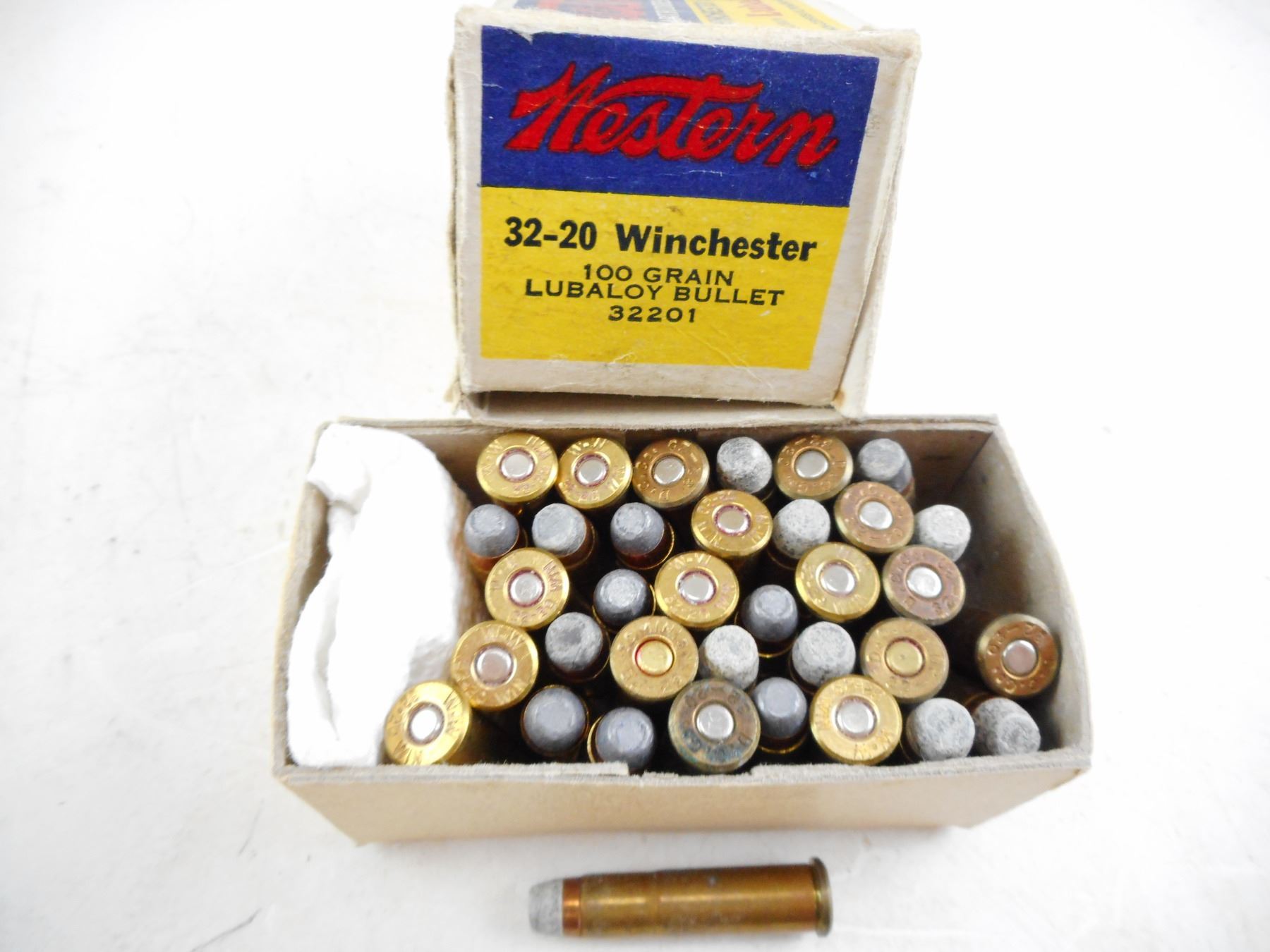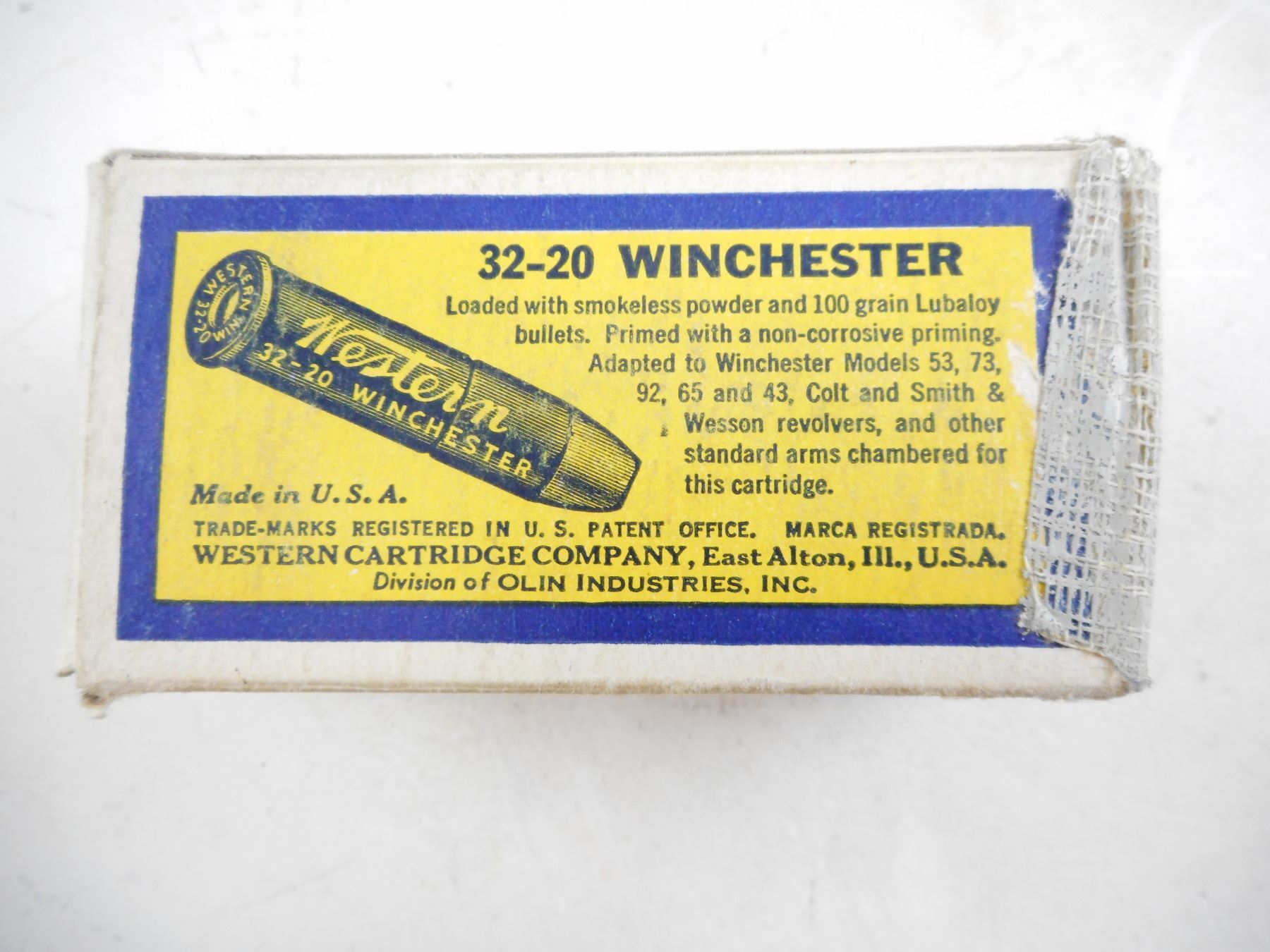 Lot 10033 32-20 WINCHESTER WESTERN AMMO IN DAMAGED COLLECTABLE AMMO BOX