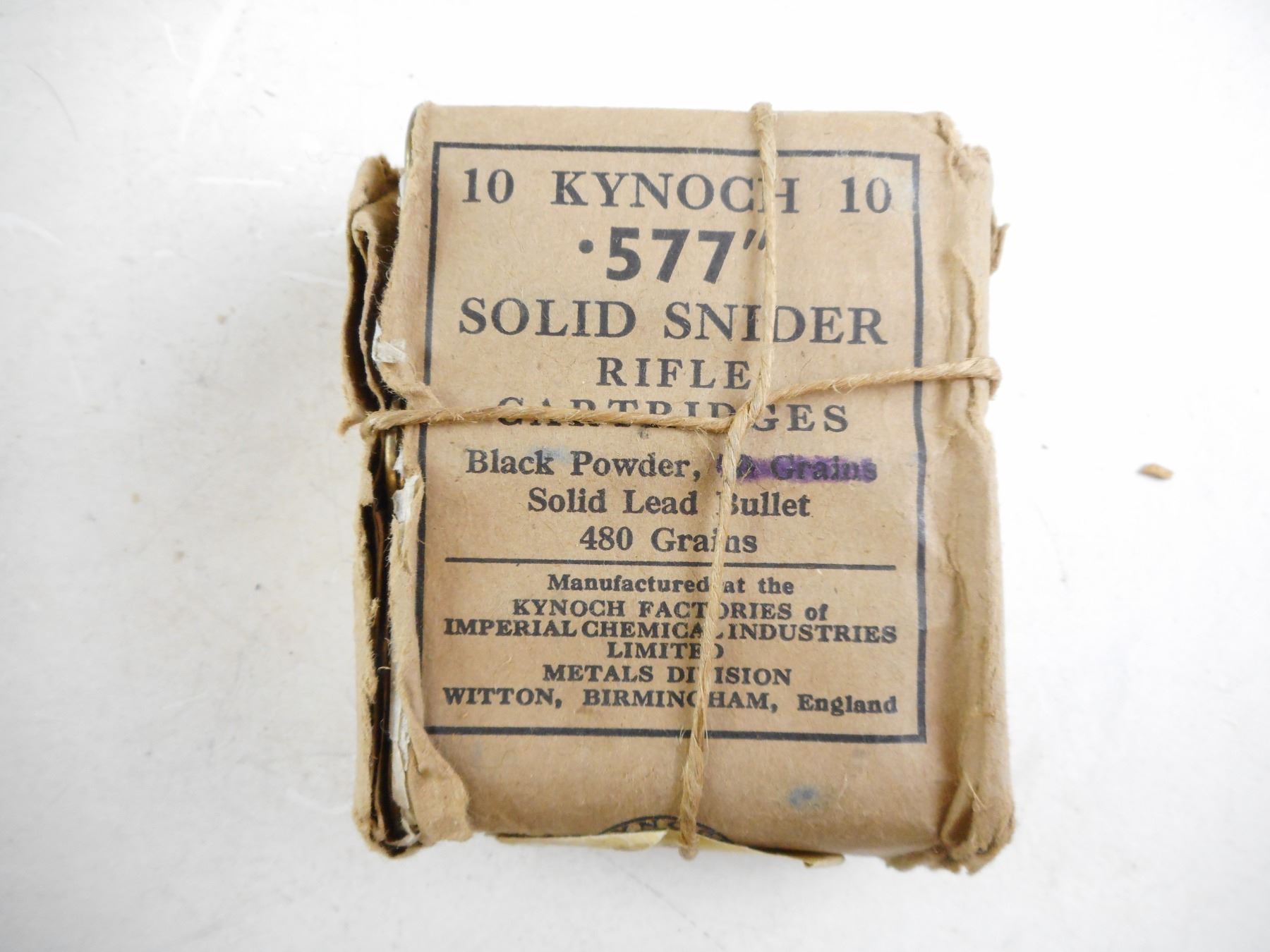 .577 SOLID SNIDER, KYNOCH COLLECTIBLE AMMO IN DAMAGED PAPER WRAPPING , 10 RNDS