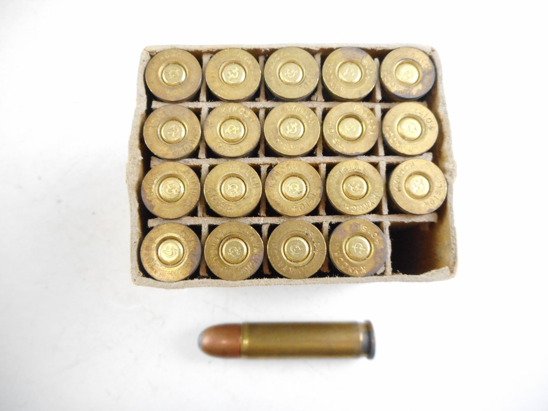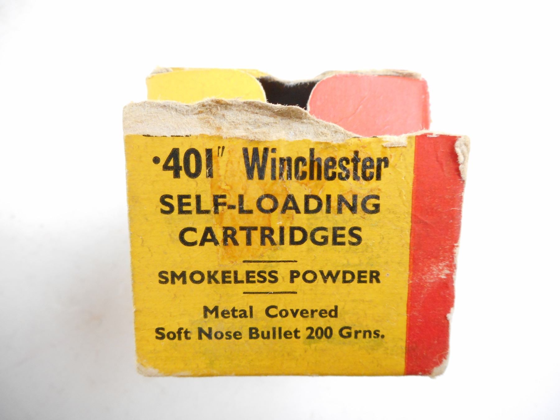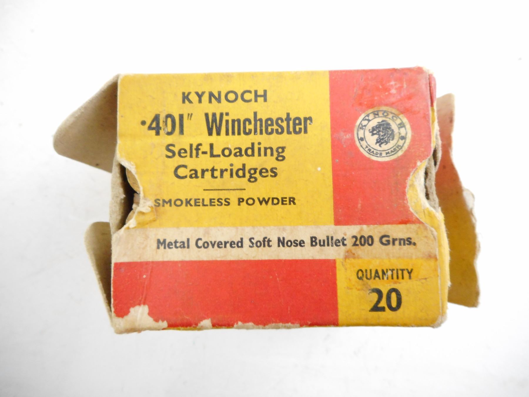 Lot 10084 .401 WINCHESTER SELF LOADING KYNOCH AMMO, COLLECTIBLE BOX IN DAMAGED CONDITION
