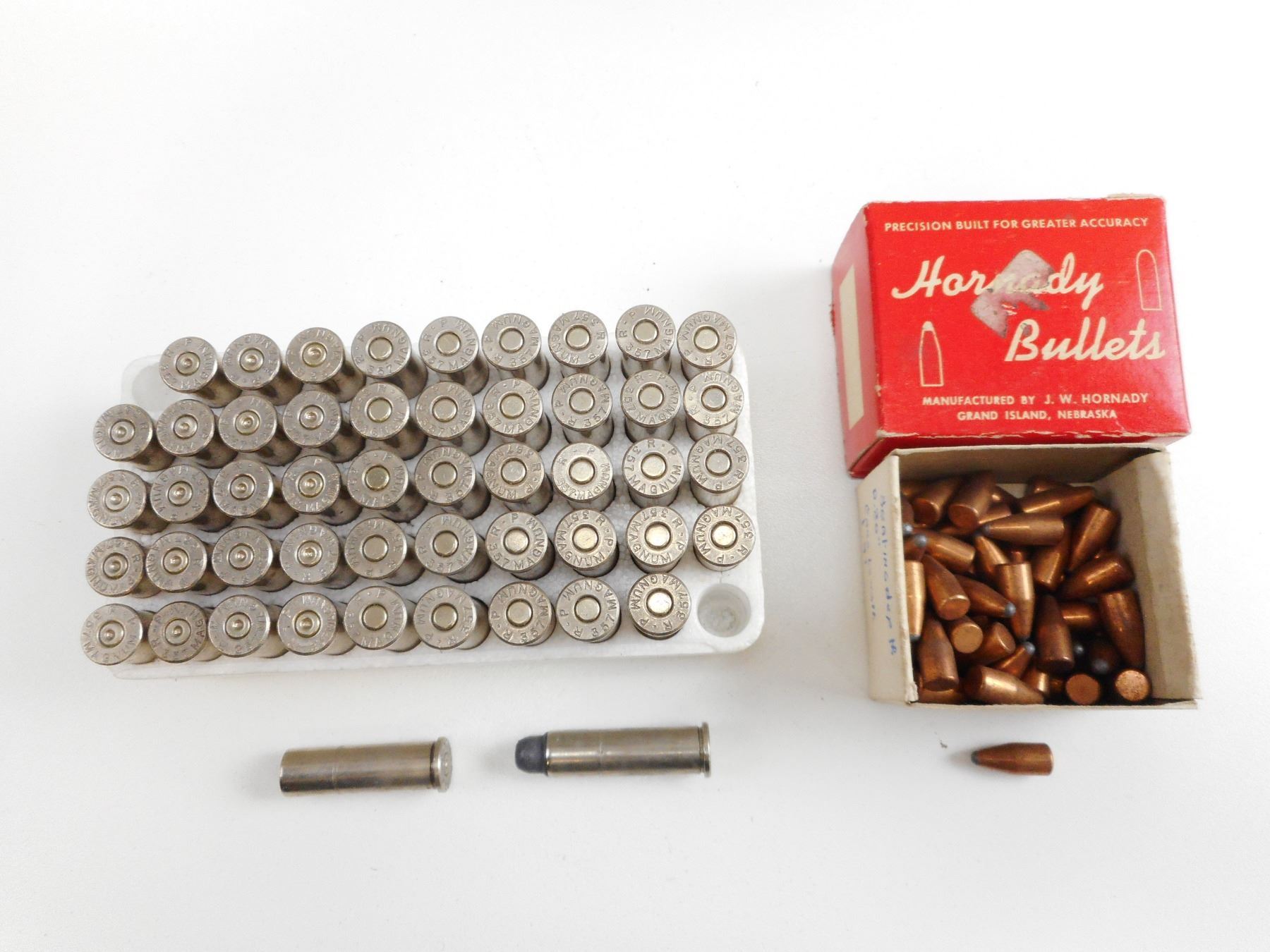 ASSORTED LOT, .357 MAGNUM, REMINGTON AMMO, .25 CAL HORNADY BULLETS , 30 RNDS, 20 BRASS CASES, APPROX .5 LB BULLETS