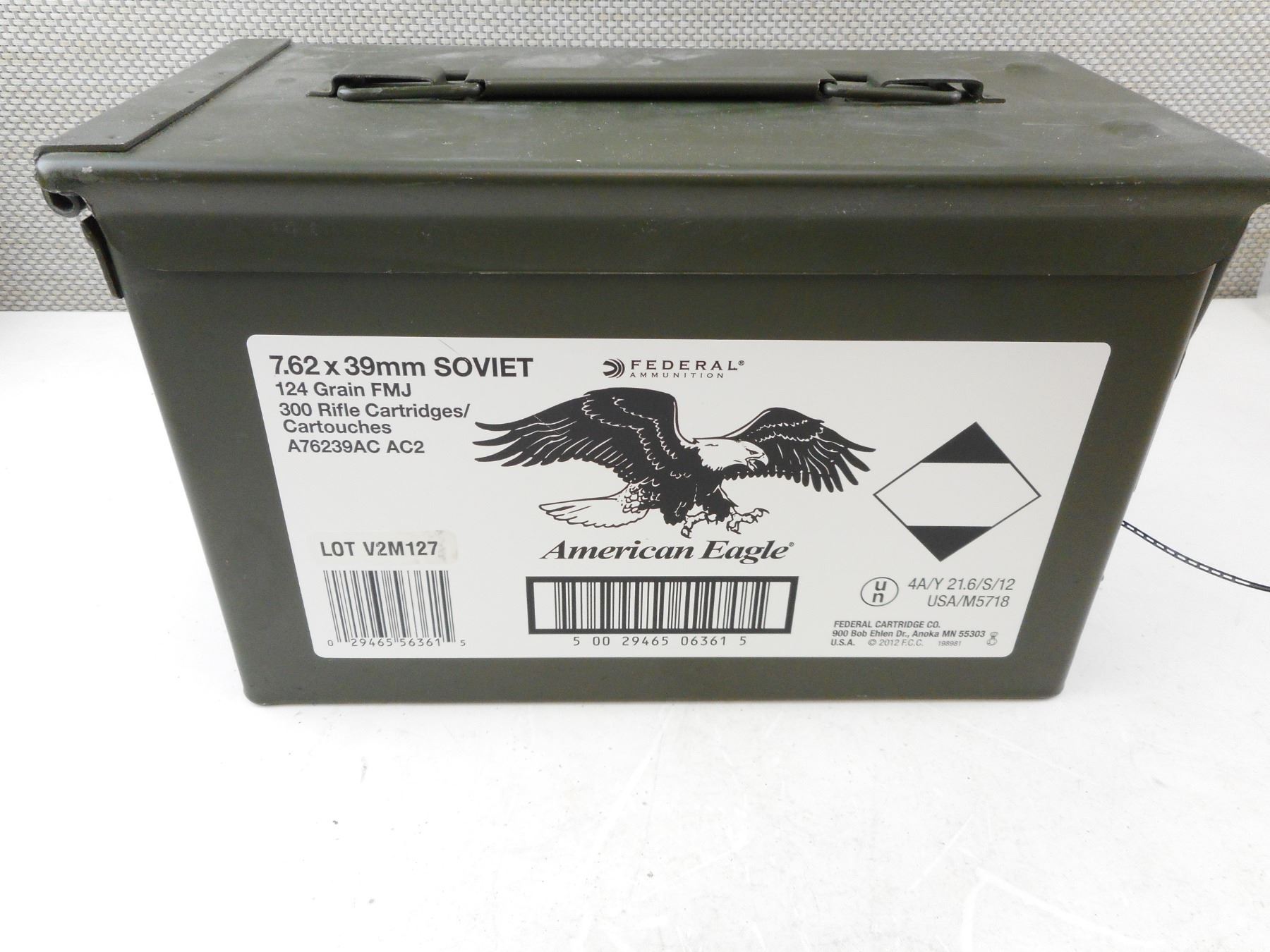 7.62X39MM AMERICAN EAGLE AMMO, IN SEALED METAL AMMO TIN, NON-CORROSIVE , 300 RNDS