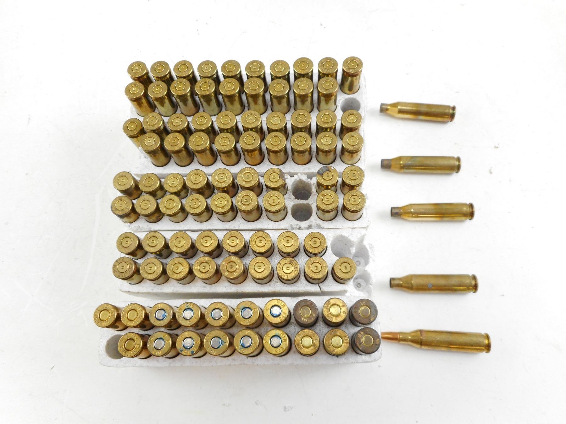 .243 WIN ASSORTED LOT, INCLUDING BRASS CASES , 20 RNDS, 77 BRASS CASES