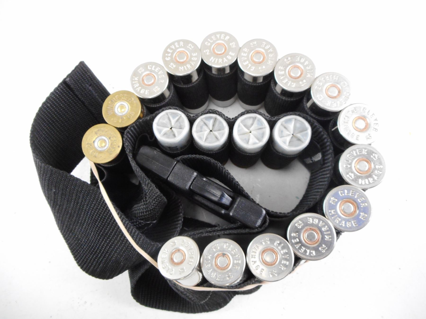 ASSORTED 12 GA SHOT SHELLS ON BELT , 19 RNDS, INCLUDING CLEVER, WINCHESTER, FIOCCHI