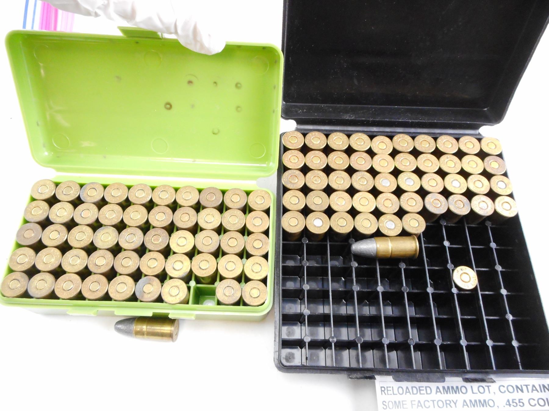 RELOADED AMMO LOT, CONTAINS SOME FACTORY AMMO, .455 COLT, , 97 RNDS, 1 PRIMED BRASS CASE. THIS IS NON FACTORY RELOADS. IT IS BEING SOLD AS COMPONENTS ONLY. USE OTHER THAN DESCRIBED IS COMPLETELY AT YOUR RISK.