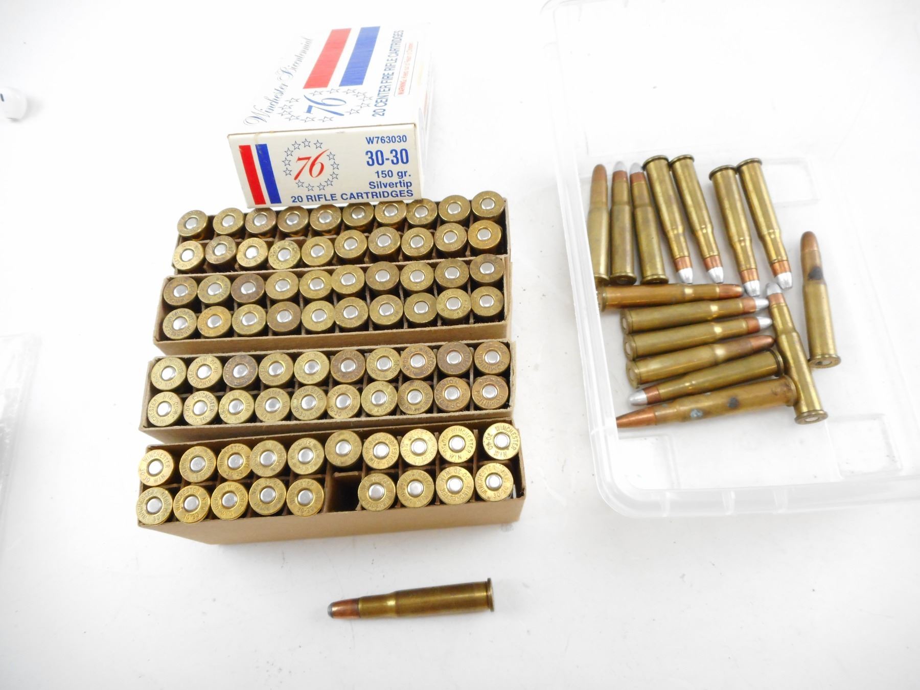 ASSORTED RELOADED AMMO LOT, INCLUDING 30-30, 1 RND .303 BRITISH, MAY CONTAIN SOME FACTORY AMMO , 95 RNDS. THIS IS NON FACTORY RELOADS. IT IS BEING SOLD AS COMPONENTS ONLY. USE OTHER THAN DESCRIBED IS COMPLETELY AT YOUR RISK.