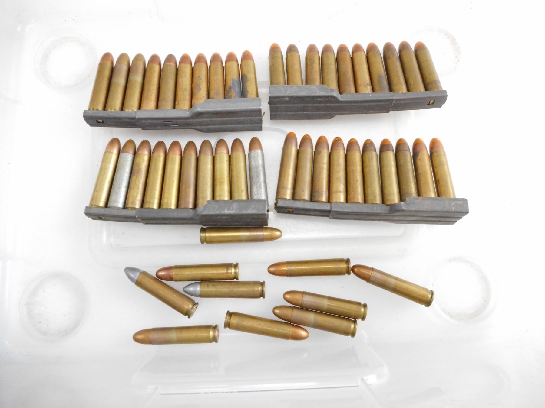 ASSORTED .30 CAL CARBINE AMMO , 50 RNDS TOTAL, INCLUDING 27 TRACERS, SOME ON STRIPPER CLIPS