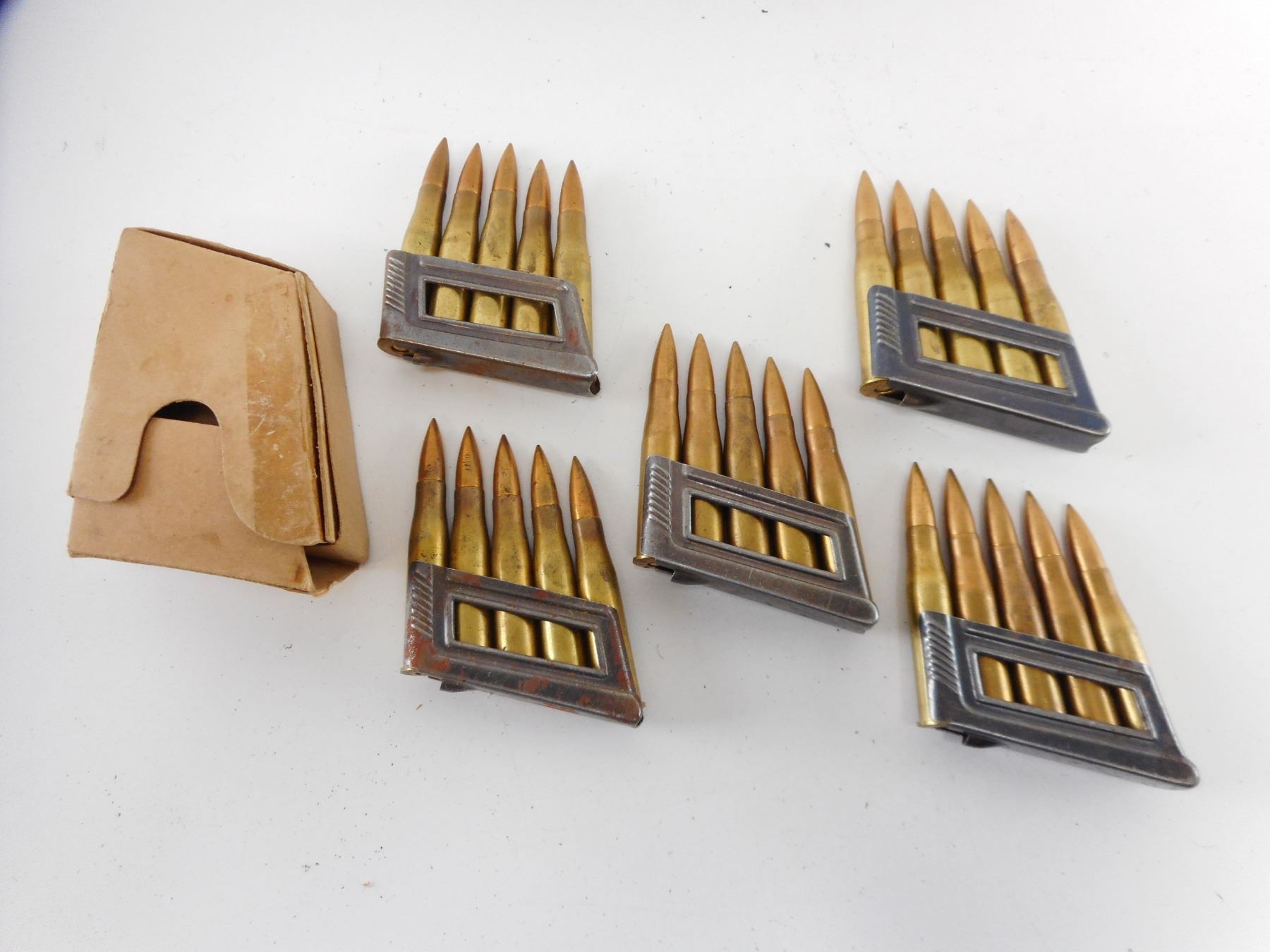 8X56R WWII ON STRIPPER CLIPS, FITS STEYR 95 RIFLES, VARIOUS DATES AND MARKINGS , 25 RNDS, 5 STRIPPER CLIPS