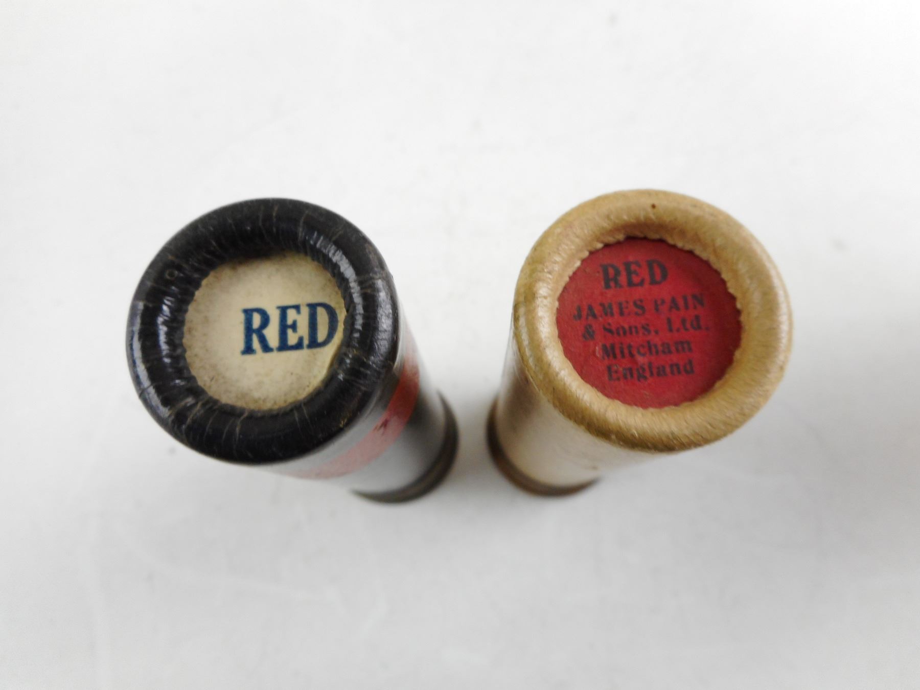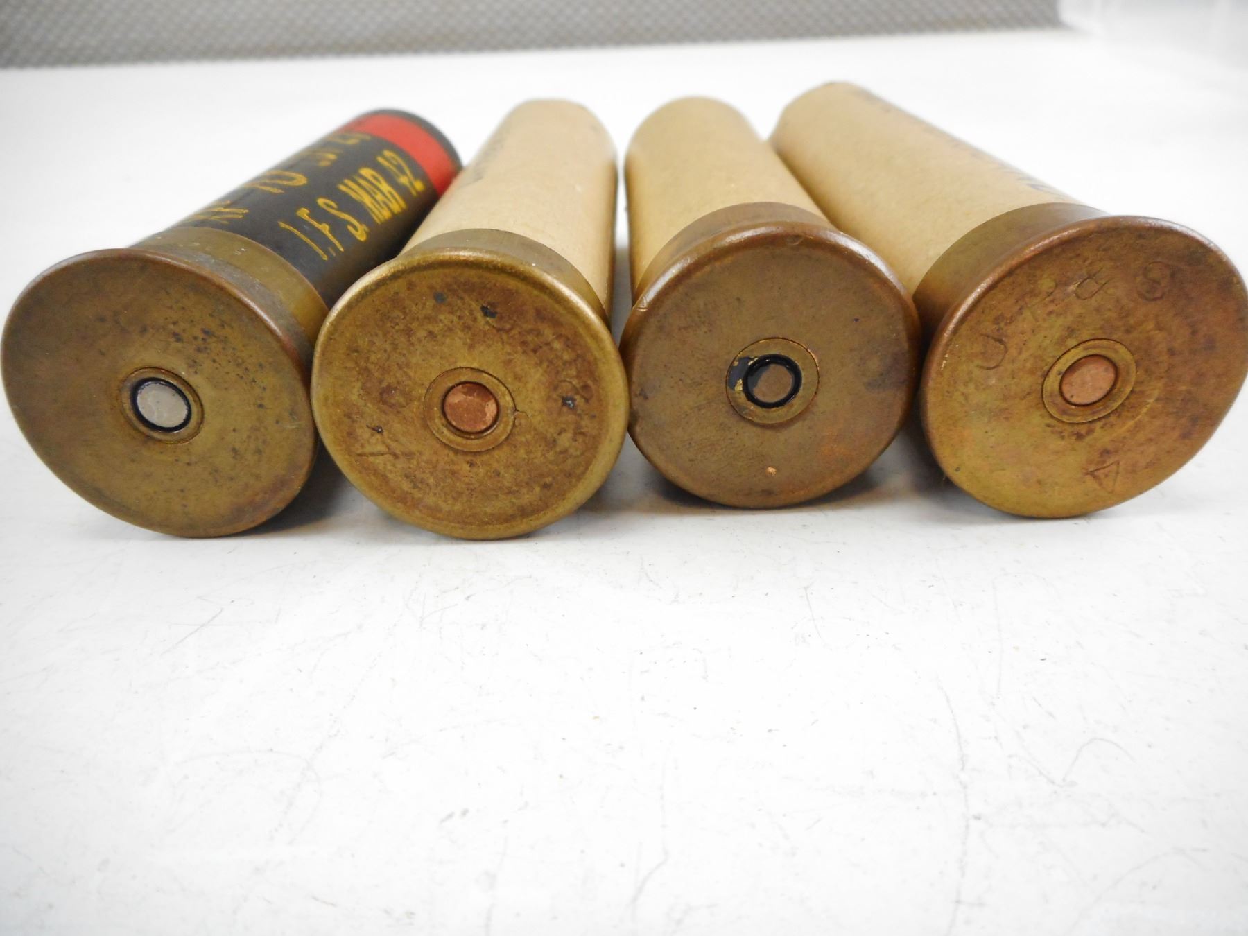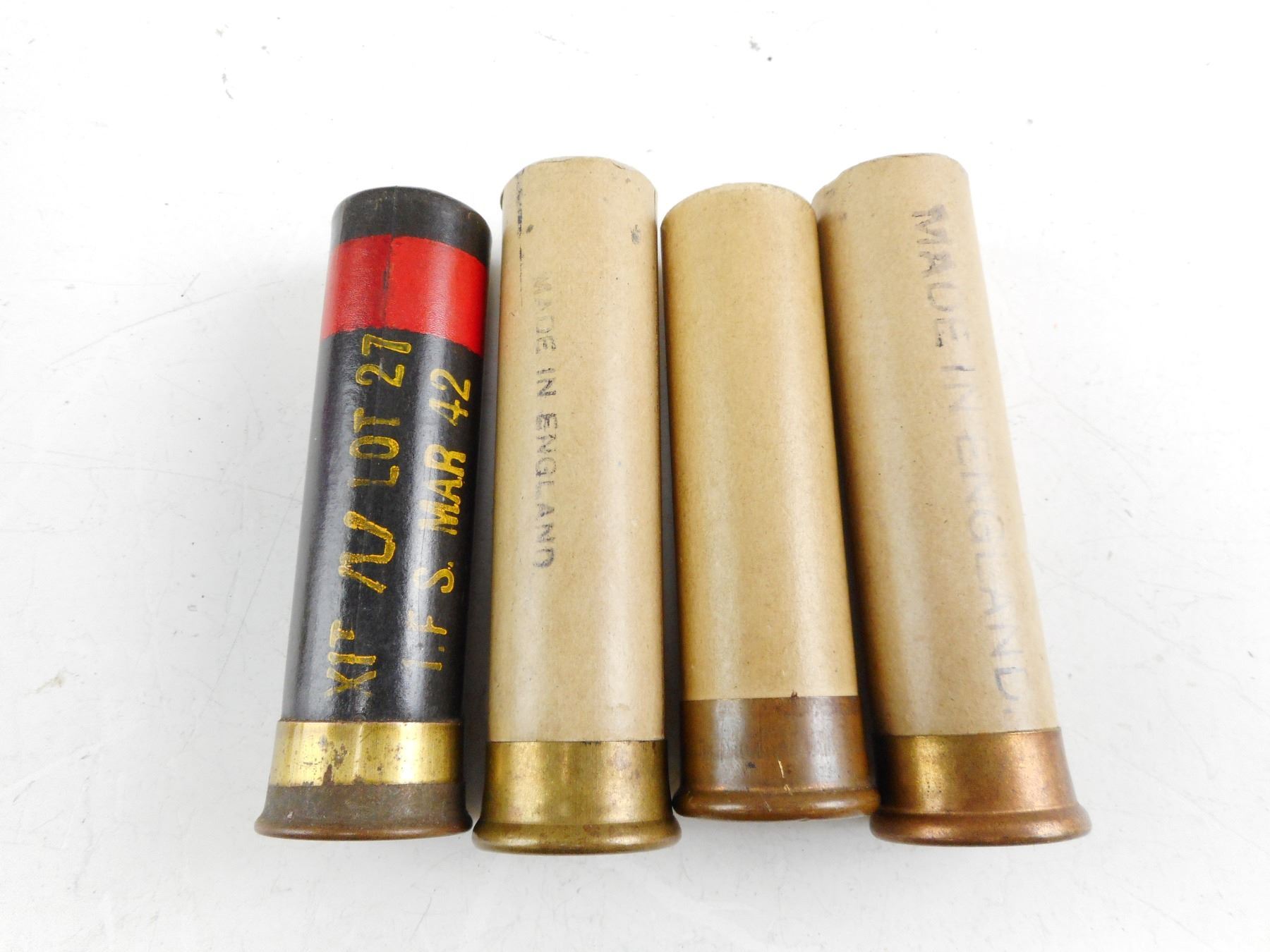 WWII 1" FLARES, 2 PRIMED CASES MADE IN ENGLAND JP S V, 1 RED XIT IFS MAR 42, 1 RED JAMES PAIN SONS LTS, ENGLAND , LOT OF 4