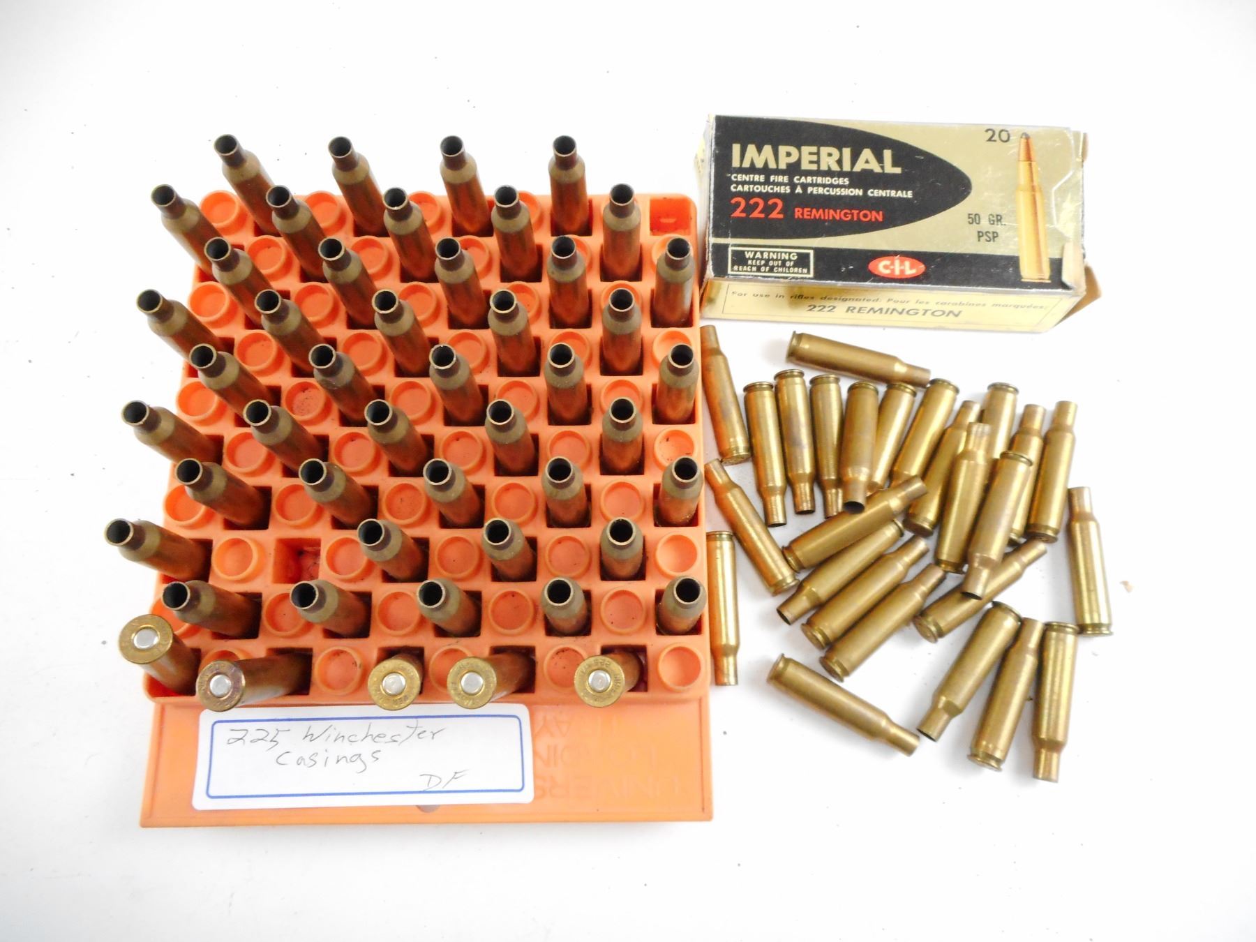 ASSORTED LOT PRIMED AND NON-PRIMED BRASS, .225 WIN, .222 REM, INCLUDES LOADING TRAY , APPROX 1.1 LBS