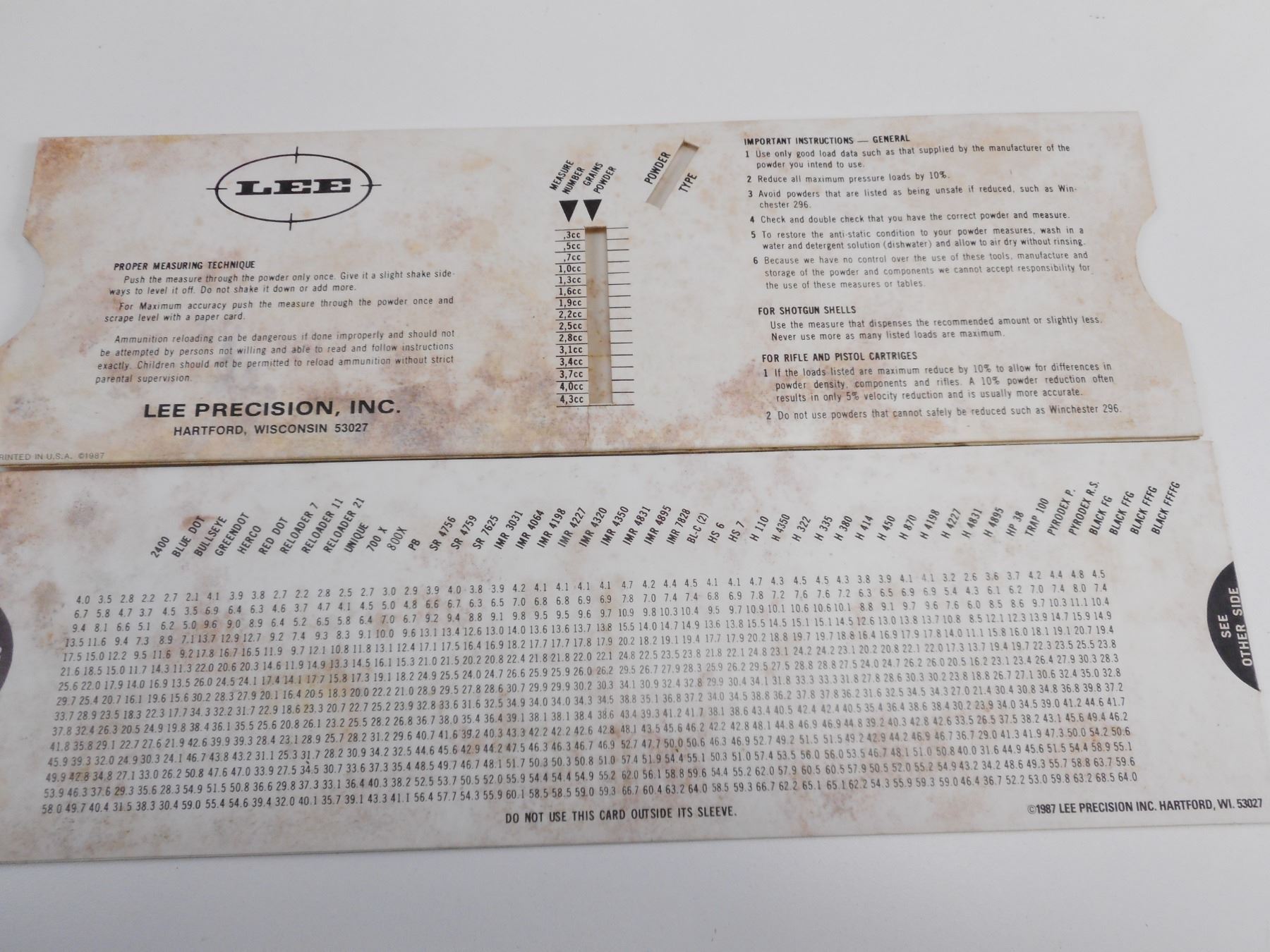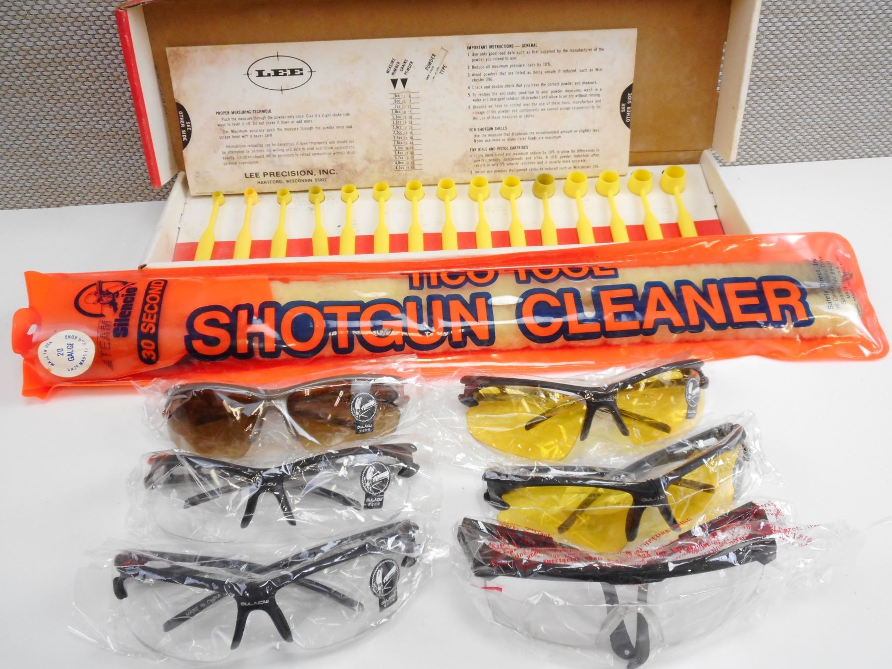 ASSORTED LOT INCLUDING POWDER MEASURE KIT , 6 PAIRS OF SAFETY GLASSES, LEE POWDER MEASURE KIT, 20 GA SHOT GUN CLEANING TICO TOOL