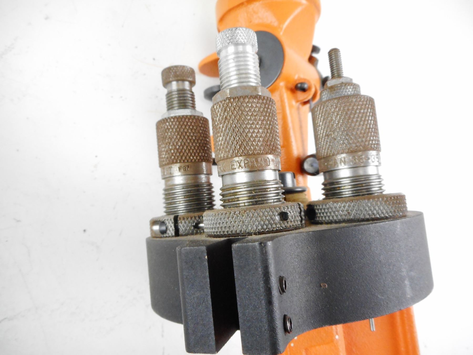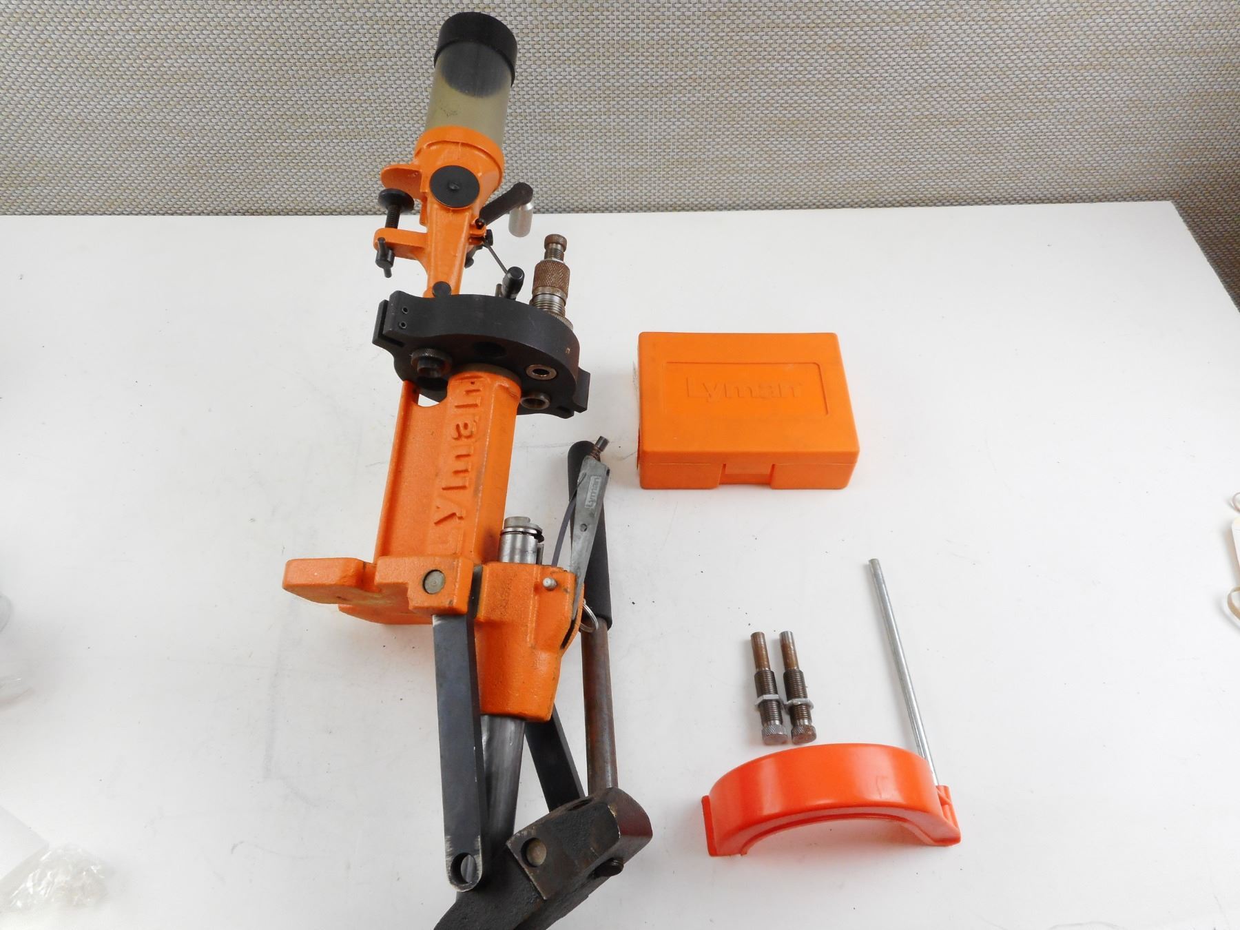LYMAN RELOADING PRESS, 38-357 , PRESS INCLUDES 3 DIES AND EXTRA UNKOWN PIECE