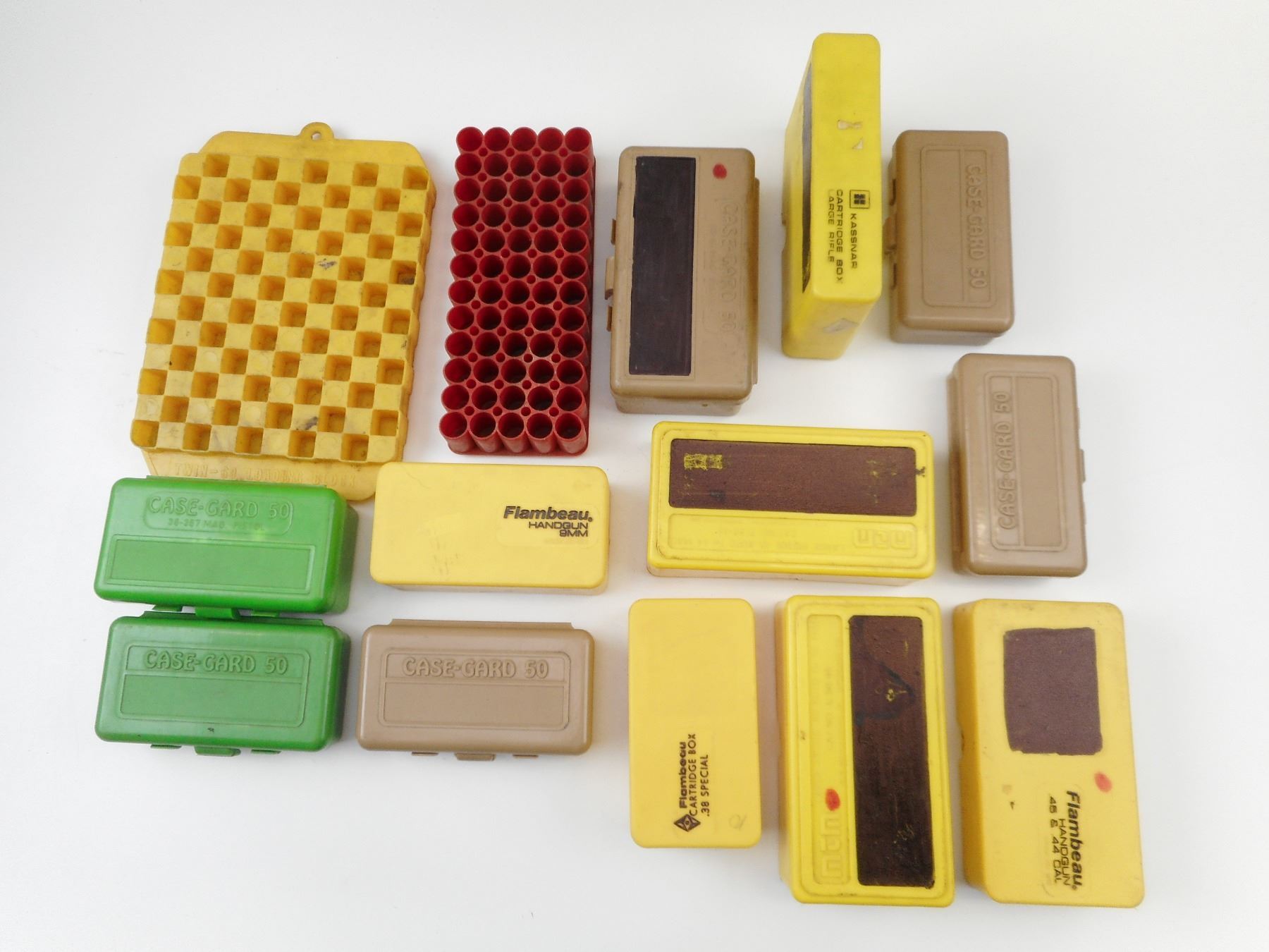 ASSORTED LOT INCLUDING PLASTIC AMMO CASES, RELOADING TRAYS , LOT OF 14