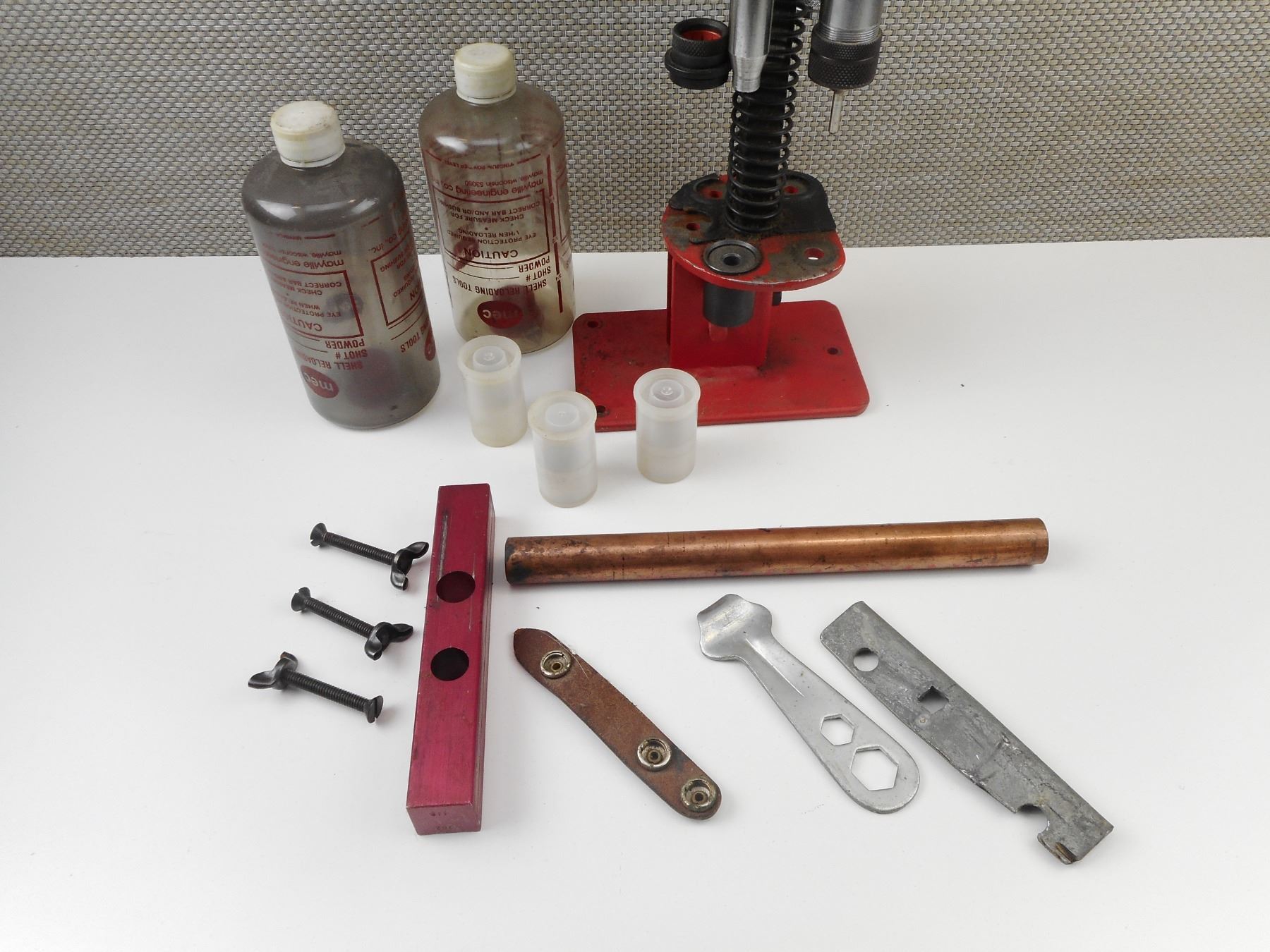 12 GA MEC RELOADING PRESS, BOTTLES, AND ACCESSORIES , 1 PRESS, 2 BOTTLES, EXTRA ACCESSORIES