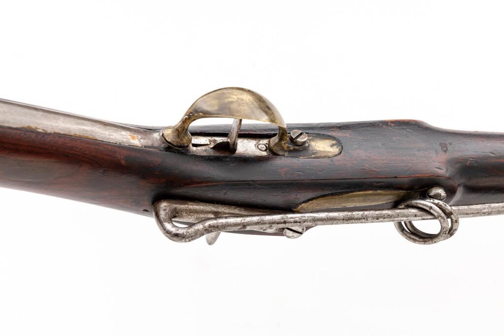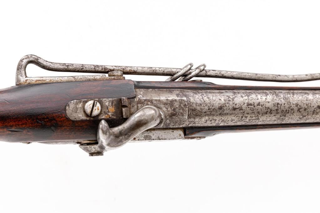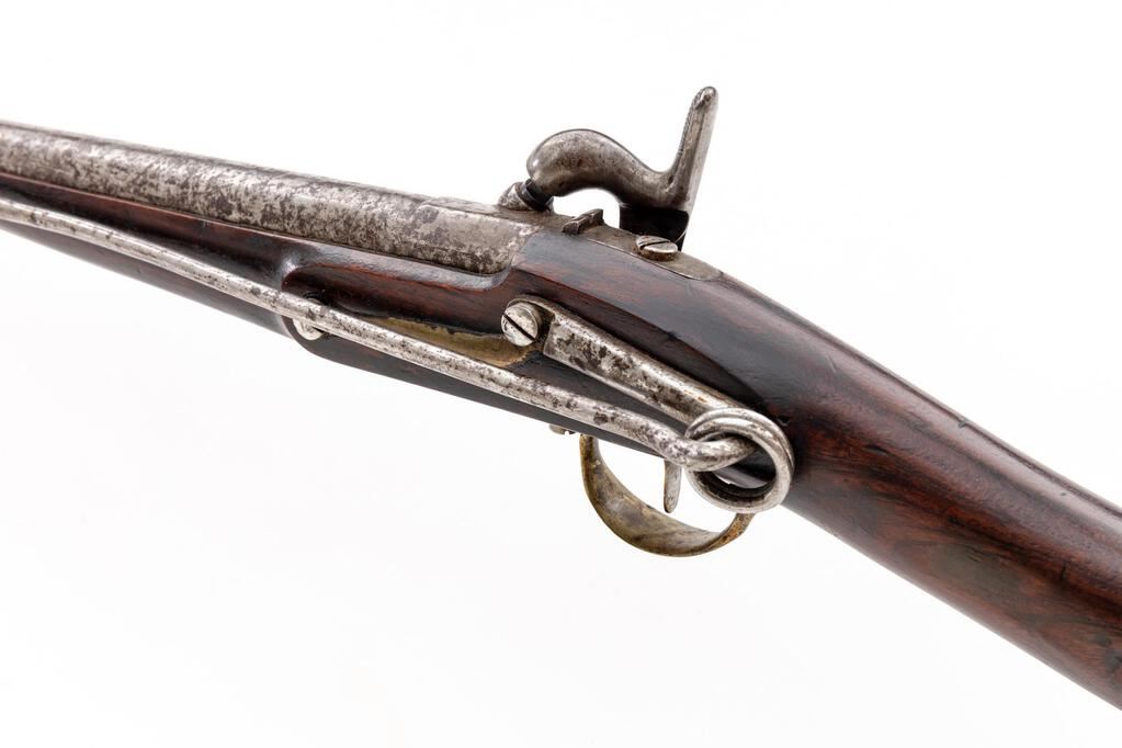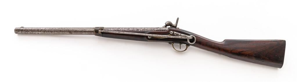 Antique French Percussion Carbine, Mfg'd at Tulle Armory, NVSN, .72 cal., 19.75" round barrel has low-blade front, notched rear sights; bevel-edge carbine lock with rounded/pointed tail marked "Mre. Imple. De Tulle/J. Manceaux Entrepl", has tall left-leaning hammer, was altered from original flintlock; 11.75" front-hinged sling bar with double rings at left side; brass fittings include trigger guard on iron floorplate, flat buttplate, serpentine sideplate, nosecap with bar attachment. Oil-finished hardwood halfstock with "fish-belly" butt profile. Condition is good showing gray gunmetal cleaned of moderate etching with fine edges and clear markings, age-toned brass. Stock is sound showing scattered mostly small marks, smooth added finish. Two-click action is crisp (replaced nipple), smoothbore is bright. Est.: $600-$900. (Antique)