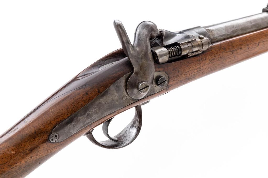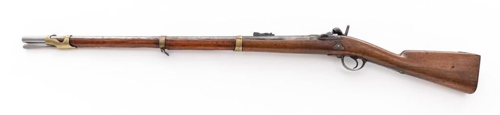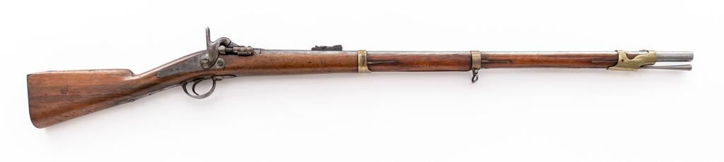 French Mle.1853-67 "Tabatiere" Breechloading 3-Band Infantry Rifle, Belgian Altered to Metallic Cartridge from Percussion, NVSN, 17.8mm, 34.6" round barrel, block-blade front and sliding-leaf rear sights, Belgian view and Liege "ELG" proofs and a sunken "O" at breech; variant Snider-style "trapdoor" breechblock is marked with 3 Belgian proofs outside, "883S" inside, has rebounding firing pin; back-action lock has distinctive "leaning" hammer, may have had markings removed; 3 brass bands, middle with sling swivel, upper double-strap band/nosecap retaining the trumpet-tip ramrod. Oil-finished walnut fullstock. Originally mfg'd 1850s. Condition is good being bright gunmetal (bit of cleaned erosion at top of buttplate) having sharp edges and markings (barrel appears to have had markings peened over at breech). Stock is sound, has thru-plug at butt, replacement wood section above lower band. Action is strong and crisp, trapdoor hinge secure, smoothbore is clean with light oxidation. Est.: $750-$1,000. (Antique)