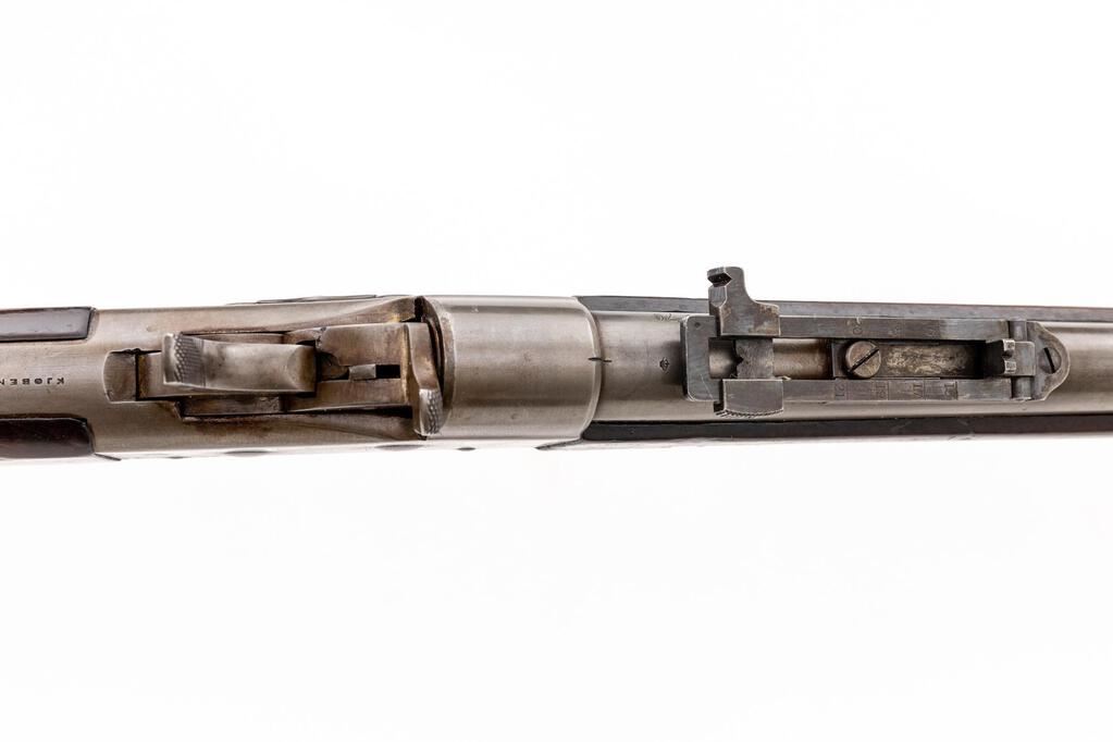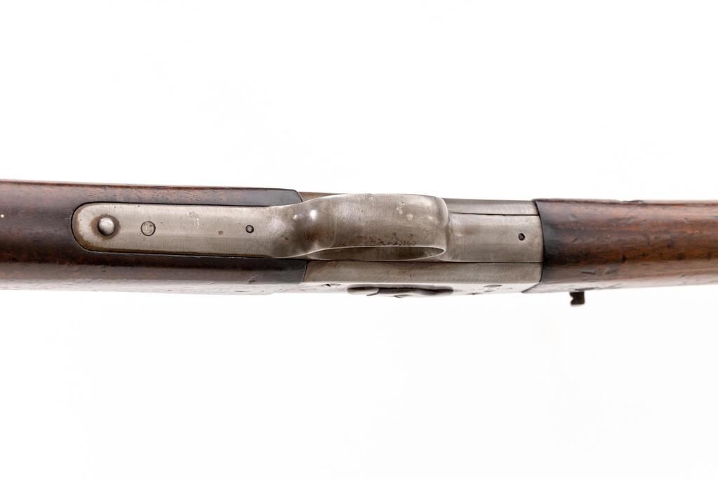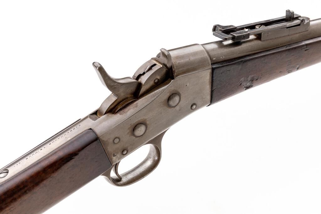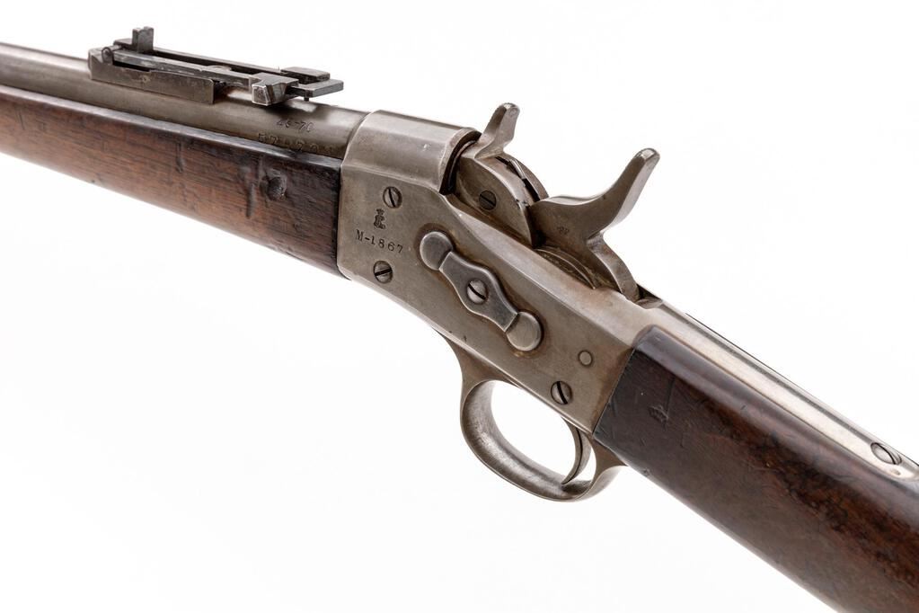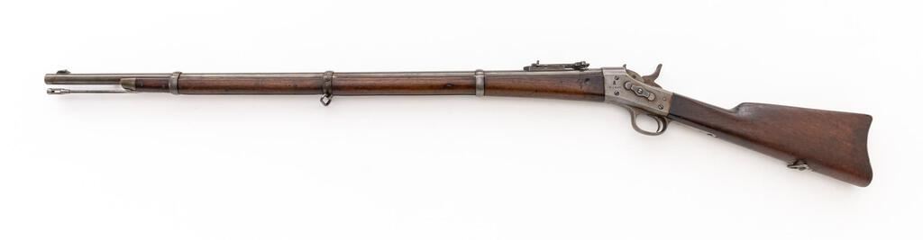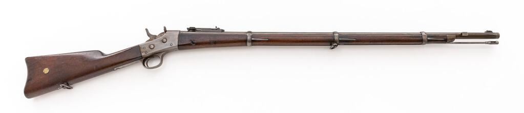 Danish Model 1867 Rolling Block Breechloading Infantry Rifle, by Copenhagen Arsenal, #57870, .45-70 CF cal., 35.25" round barrel with wide dovetailed blade front and 3.5" folding-leaf rear sight, marked "45-70", serial number, "(crown)" at left breech, "(crown)" at top, with 3.9" bayonet lug at right; large No. 1 size receiver with auto-extraction is marked with a Birmingham proof and "M-1867" at left, "Kjobenhavns Toihuus 1880" at top tang. Oil-finshed walnut forestock has 3 spring-retained bands (middle with swivel), nosecap, slotted/grooved ramrod, matching buttstock a curved buttplate with "(crown)" mark at top, .625" circular brass inventory disc at right, swivel at belly. Mfg'd under license to Remington. Condition is good showing smooth bright metal with sharp edges and markings. Stocks are sound and smooth with minimal marks (forend with shallow scrapes left/right near frame). Action is crisp, bright bore shows overall light frosting and sharp rifling. Est.: $700-$900. (Antique)