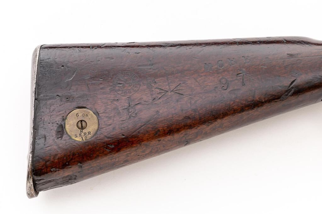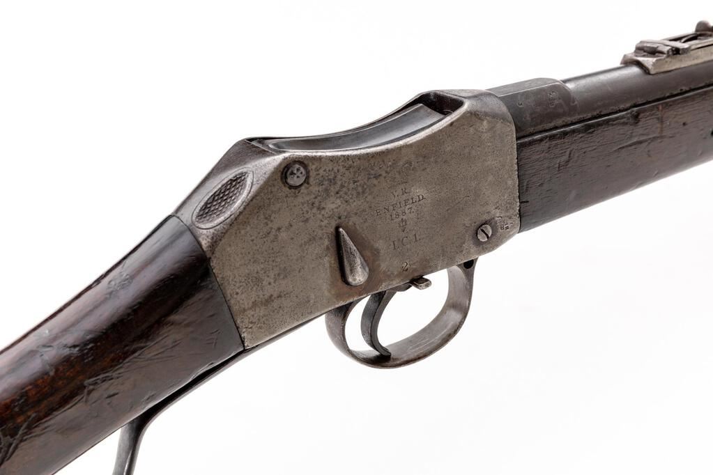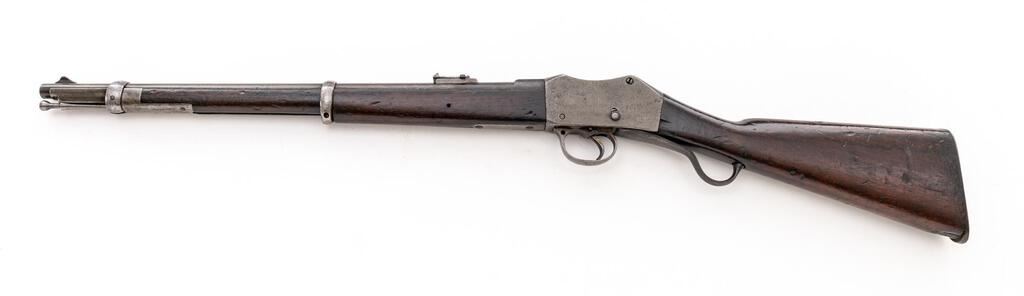 Antique Martini-Henry Enfield Breechloading IC1 Cavalry Carbine, NVSN, .455 CF cal., 21.4" round barrel, winged blade front and sliding-leaf rear sights, marked with numerous British marks including "(crown)/V.R./1.P.", "(crown)/V.R./(crossed swords)/2.P.", "(crown)/E/6", "(star)" and "(facing broad arrows)" (sold out of service mark) in area of raised breech; flat-side receiver is marked "(large crown)/V.R./Enfield/1887/(crown/broad arrow)/I.C.1.", "2" and "(crown)/BF" at right, has dropping breechblock operated by 5.5" underlever marked "(broad arrow)/WD/(crown)/E/29"; steel fittings include trigger guard marked "(crown)/E/69", straight buttplate marked "(broad arrow)/WD/(crown)/E", 2 clamping bands, 6" nosecap retaining the button-tip ramrod. Oil-finished 2-pc. English walnut fullstock has right-side 1" brass roundel marked "6.04/M/5Krr/12", .75" impressed roundel marked "Birmingham 1894" surrounding "(broad arrow)/WD", and "1/2", "(facing broad arrows)", "MCBB/97". Mfg'd ca. 1887. Condition is good retaining traces of blue and scattered oxidation and discoloration over gray gunmetal, fine edges and markings. Stocks are sound showing rather heavy age and military use marks, a thru-hole 4" ahead of receiver, generally good markings and perhaps added finish. Action is strong and crisp, bore is bright showing 2" light erosion at muzzle and sharp polygonal rifling. Est.: $700-$900. (Antique)