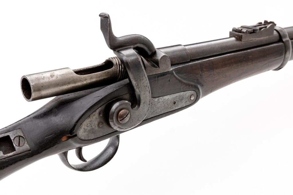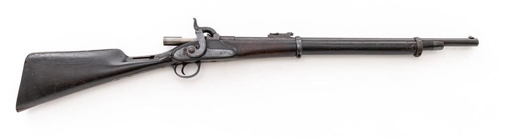 Most Unusual Antique Probably European Breechloading Short Rifle, Unmarked as to Maker or Origin, NVSN, .577 cal., unmarked 24" round barrel has dovetailed blade front and folding-leaf rear sights; 1.25" breech section has percussion nipple-type fitting that may have been intended to house a firing pin, and a 4.25" "receiver" threaded into back end with a 1.25" opening for loading/extracting metallic cartridges (receiver was never completed, as it is open at rear). Unmarked flat lockplate with large military-style hammer. Steel fittings include trigger guard with long rear tang, buttplate, 2 clamping bands, nosecap. Lack of a ramrod indicates likely mfg'd as a cartridge arm. 3/4 stock of oil-finished walnut has small wrist area with inlet iron "keyhole" plate for an unknown attachment. Condition is good to very good as configured, the barrel retaining what appears to be much thinning and dulling original blue, balance of the metal reblued over occasional pitting. Stock is sound showing 1.75" replaced wood at toe, scattered minor dings, later varnish. Hammer and trigger function, brilliant bore shows sharp and deep rifling. Possibly an inventor's model due to its unfinished state or intended as an experimental/trials piece. Est.: $900-$1,200. (Antique)