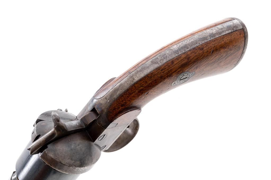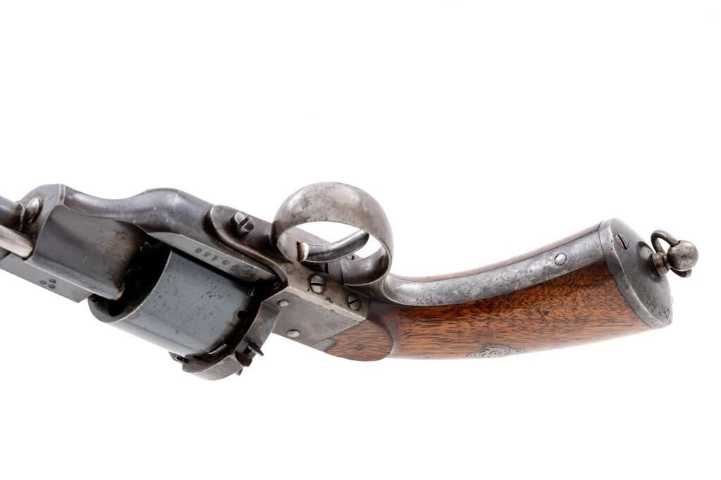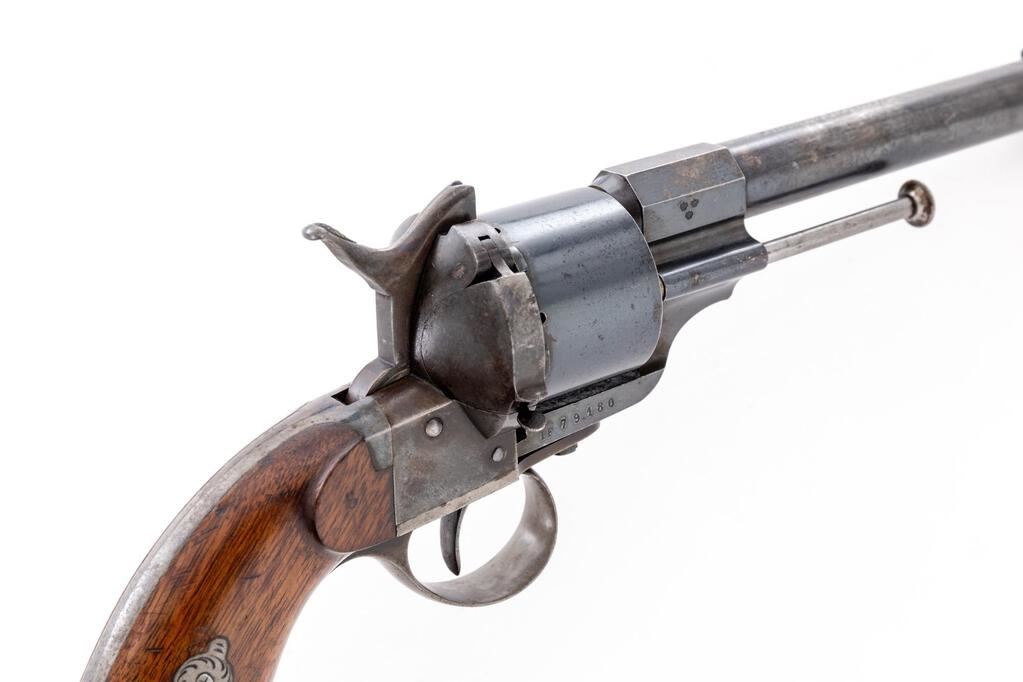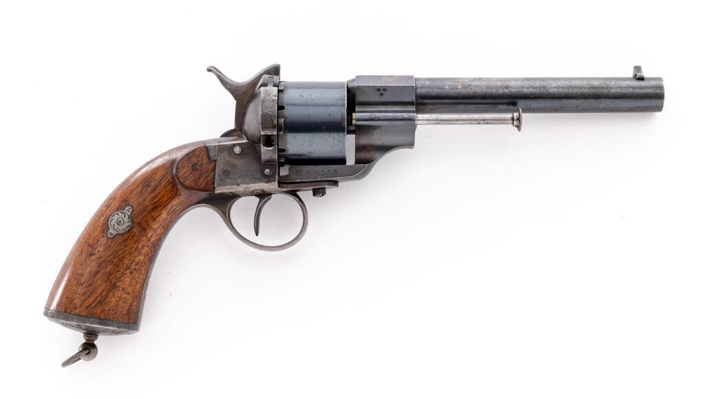 Civil War-Era Lefaucheux Model 1854 Single Action Military Pinfire Revolver, #79180, 12mm cal., 6.25" round barrel marked "E. Lefaucheux Brte.S.G.D.G. a Paris" on top; plain 6-shot round cylinder; open-top frame is marked with 3 tiny "(crowns)" at right lug, "IF" and serial number below, oval Lefaucheux logo at left side overstamped "L:I23 No. 63b No. 18", has sliding ejector rod and hinged loading gate at right, integral straps with lanyard ring at oval butt (electro-penciled "140414 2471"), 2-pc. varnished walnut grips. Mfg'd ca. 1854-70. Condition is near excellent retaining approx. 75% deep original barrel blue, 99% to cylinder, and softly-mottled case colors. Grips are sound and smooth having light marks, lovely grain, color and finish. Action is strong and crisp, bore is bright with sharp rifling, 1" light oxidation at muzzle. Est.: $1,200-$1,800. (Antique)
