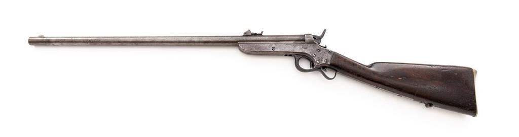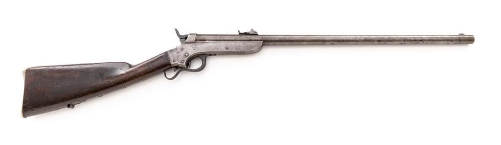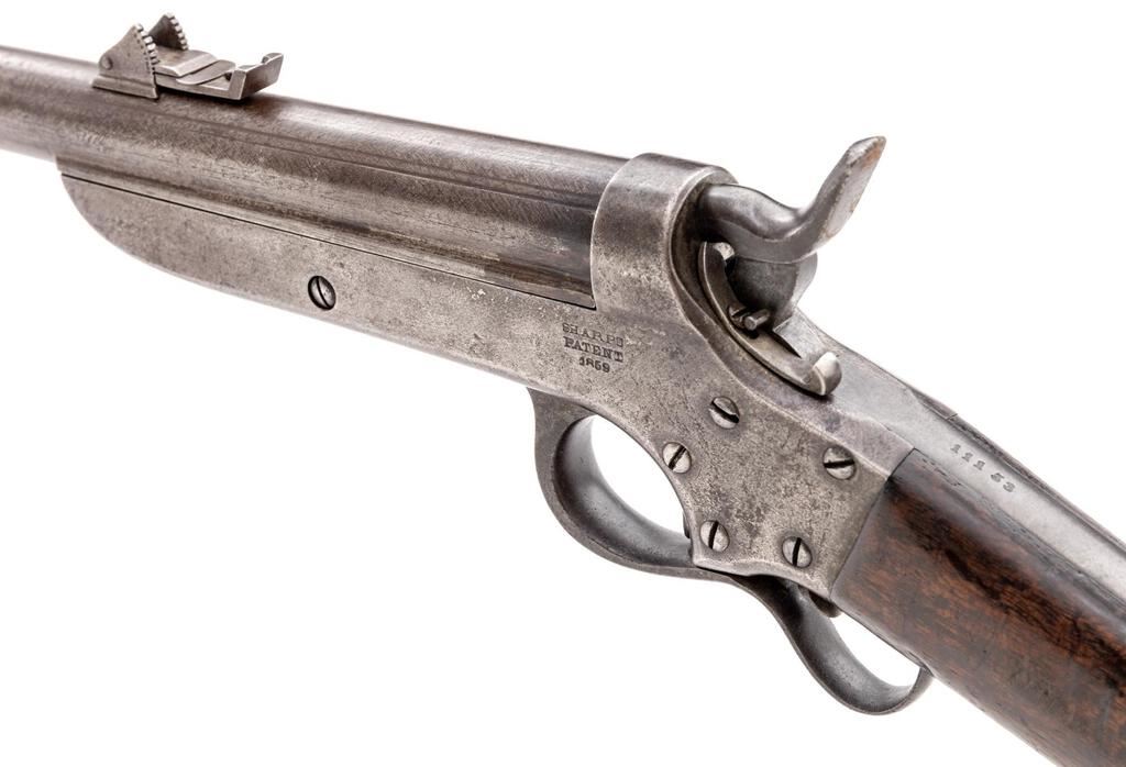 Rare Civil War Sharps & Hankins Model 1862 Breechloading Army Carbine, 2nd Type, #11153, .52 RF cal., 24" round barrel, blade front and unusual elevation-adjustable leaf rear sights; 8.25" receiver marked "Sharps/&/Hankins/Philada." at right and "Sharps/Patent/1859" at left has sliding hammer safety, serpentine trigger guard/operating, long tangs retaining the oil-finished walnut buttstock with sling stud at belly and peaked brass buttplate. Mfg'd 1862-65, est. just 500 qty. this variant. Condition is good retaining no original finishes but smooth gray-brown gunmetal having sharp edges and markings. Stock is sound showing scattered dings, added varnish. Action is smooth and crisp, bore shows overall light-to-moderate etching, fine rifling. Est.: $1,000-$1,500. (Antique)