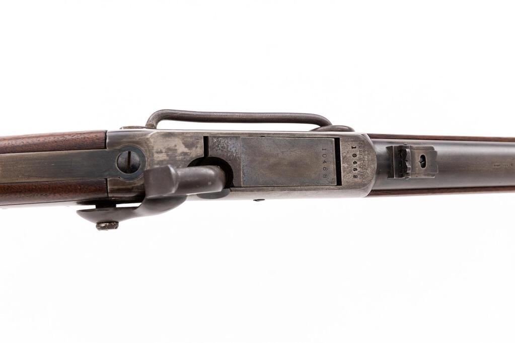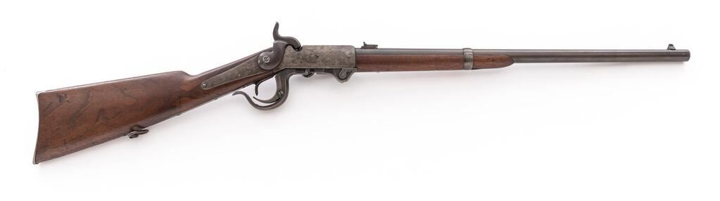 Civil War Burnside Breechloading Percussion Carbine, 5th Type, #10468, .54 cal., 21" round barrel marked "Cast Steel 1864" and "H", with standard carbine sights; receiver with curved trigger guard/operating lever, marked "Burnside's Patent/Model 1864/10468" at front and several inspectors' marks, has sling ring/bar at left; back-action lock and military hammer are both marked "H". Oil-stained walnut forend has single band, matching buttstock with 2 "G.C." cartouches of Inspector George Curtis at left wrist has semi-crescent buttplate (marked "C"), swivel at belly. Mfg'd 1864. Condition is fine retaining good traces of blue, mostly silvered case colors, else smooth gray/brown gunmetal with sharp edges and markings. Stocks are sound and smooth (.75" ding at forend) with a large "A" carved at right, clear cartouches, pleasing added oil finish. Action is crisp, bore is bright with sharp rifling. Est.: $1,800-$2,400. (Antique)