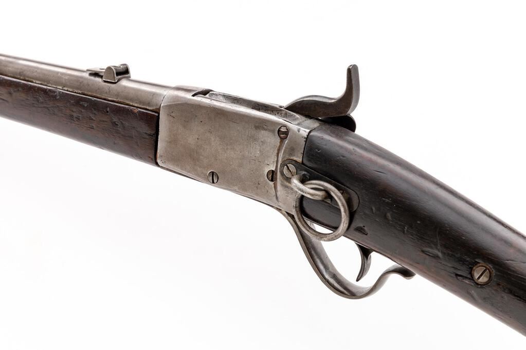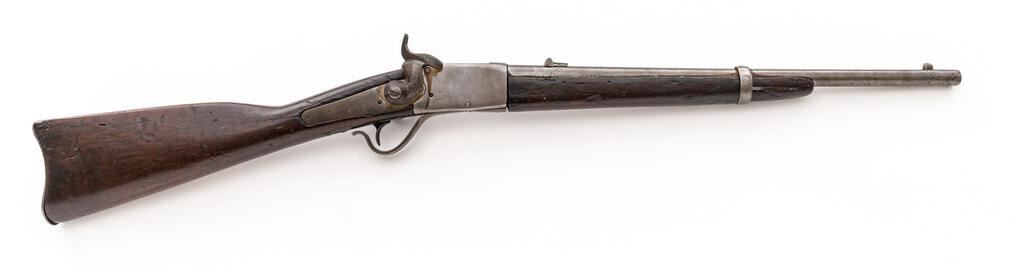 Antique Peabody Breechloading Carbine, by Providence (RI) Tool Co., NVSN, .50 RF cal., 20" round barrel, block-blade front and single-leaf rear sights; 4" receiver marked only "E" at top has serpentine trigger guard/operating lever, 5.25" back-action lockplate with military hammer, left-side sling ring/mount. Oil-finished forend has a single spring-retained band (marked "N"), matching buttstock with carbine buttplate. Mfg'd ca. 1866-71. Condition is good retaining no original finishes, being bright metal lacking all markings due to removal of heavy pitting. Buttstock shows 4" crack at left forward of buttplate, 3" crack behind lock, forend with 4.75" filler at former ramrod channel, both with dings from age and military use but sound. Action is crisp, bore shows overall light etching and fine rifling. Scarce, as most were sold to foreign militaries. Est.: $900-$1,200. (Antique)