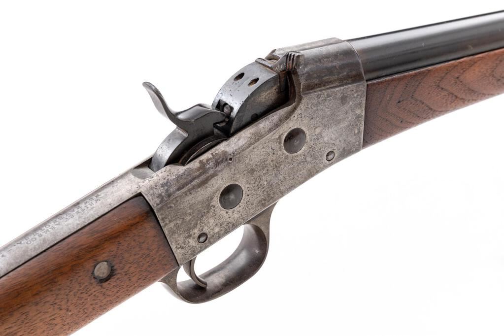 Rare Whitney-Remington Type II Rolling Block Shotgun, #84885, 20 ga., 32" tapering round barrel has shotgun-style bead front sight; rolling-breechblock receiver marked "Whitney Arms Co./Whitneyville, CT, U.S.A." at top tang, serial number below, with auto extraction. Oil-finished walnut forend/buttstock, carbine buttplate. Mfg'd 1881-88 in less than 1,000 qty. Condition is very good retaining approx. 85% thinning and toning barrel blue, silvering case colors, sharp edges and markings. Stocks are sound and smooth, there being a secure 4" hairline at left comb reinforced by two thru-rivets. Action is frozen, breechblock may have had a repair, clean bore shows overall light frosting. This shotgun is a very rare Whitney rolling block variation. Est.: $600-$800. (Antique)