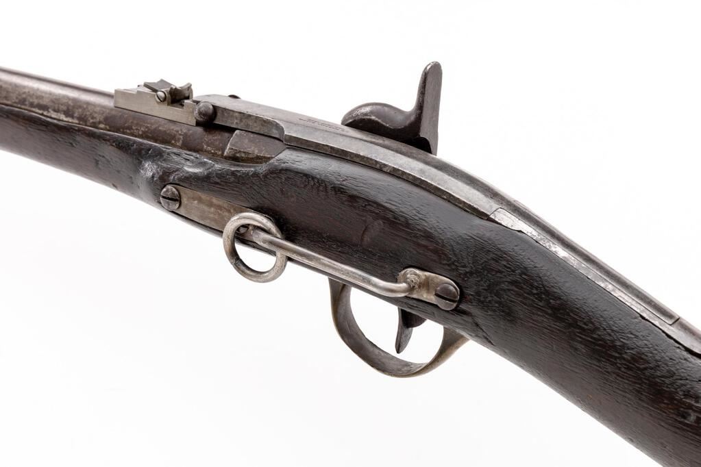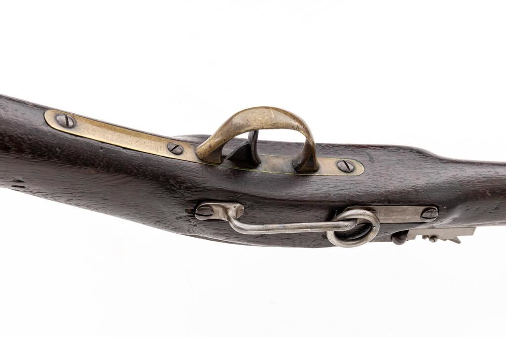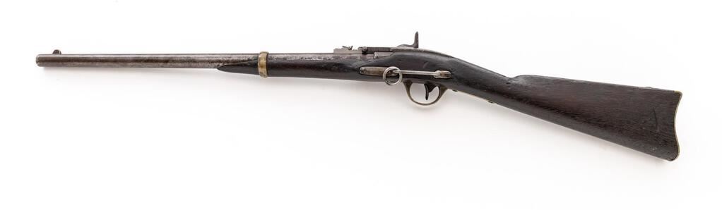 Civil War Merrill Breechloading Percussion Carbine, 1st Type, #10929, .54 cal., unmarked 22.1" round barrel with standard sights; long receiver has 8.25" rear-hinged breech-lever marked "J.M. Merrill Balto./Pat. July 1858" with articulated plunger to seat combustible cartridge in chamber, nipple bolster with cleanout screw; beveled lockplate has Merrill marking, "Apl. 9 May 21-26-61" below, serial number at rear. Brass fittings incl. trigger guard, 4.4" patchbox, buttplate marked "G", screw-retained band. Oil-finished walnut halfstock has splinter-type forend, 5.25" sling bar/ring at left. Condition is good, the bright metal having oxidation/light erosion (breech lever smooth gray gunmetal), sharp edges and markings, age-toned brass. Stock is sound showing age and use marks, hairline cracks at wrist, re-shaping at wrist/forend, added finish. Replacement rear sight. Action is crisp, breech hinge sound, bore shows moderate erosion, good rifling. Est.: $1,500-$1,800. (Antique)