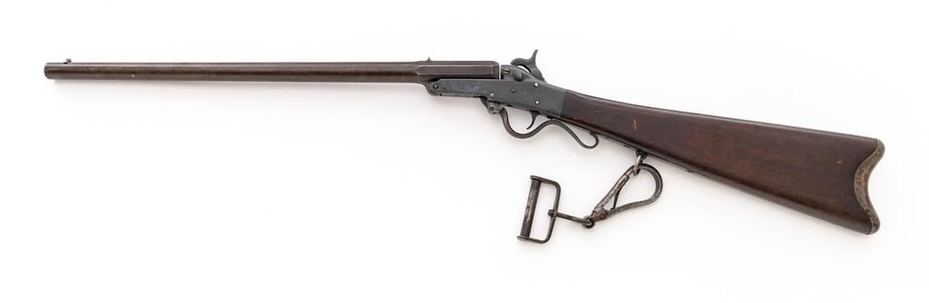 Pre-Civil War Maynard Breechloading Percussion Carbine, 1st Model, with Sling Clip and Swivel, #4805, .50 cal., 20" round barrel, early open sights, 3.5" octagonal breech; receiver has Maynard patent tape primer at right, serpentine trigger guard/operating lever, marked "Maynard Arms Co./Washington" at right, "Manufactured by/Mass. Arms Co./Chicopee Falls" at left. Buttstock of oil-finished walnut has 2.5" steel patchbox marked "Maynard Patentee/May 27, 1851/June 17, 1856", C-curved buttplate, sling ring at lower tang. Mfg'd ca. 1858-59. Condition is very good, the barrel being smooth blue-brown, the receiver dark patina with excellent edges and markings, else gray gunmetal incl. sling attachment. Stock is sound and smooth showing minimal marks, most finish. Action is crisp, barrel hinge secure, bore shows light oxidation, sharp rifling. Est.: $1,800-$2,400. (Antique)