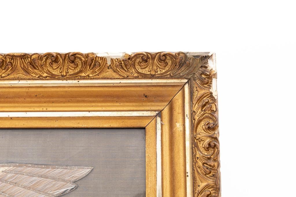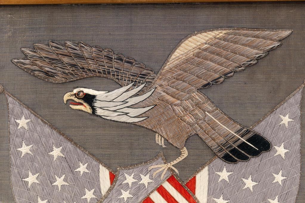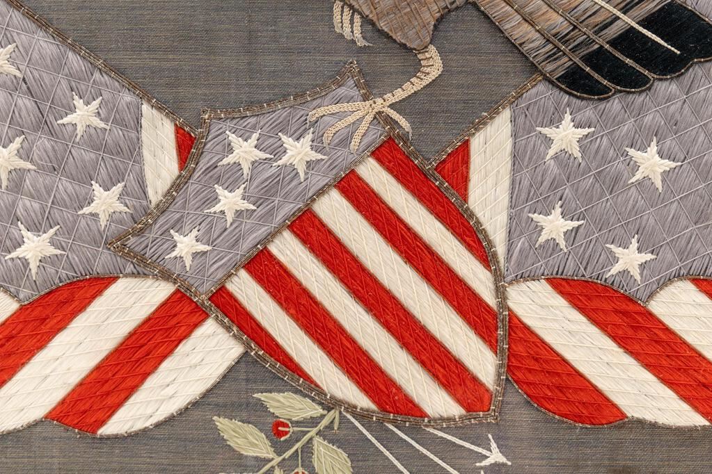 Vintage Patriotic Embroidery, showing eagle over American flags and banner "E Pluribus Unum".  Approx. 16"x17", of silk and metallic thread, with marble eagle eye.  Condition is good with minor soiling to bottom portion of fabric background.  Gold gilt frame shows some damage to edges.  Est.:  $200-$300.