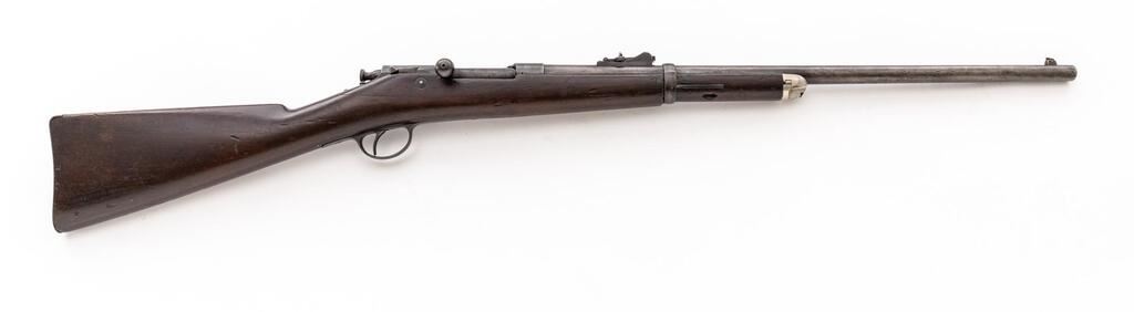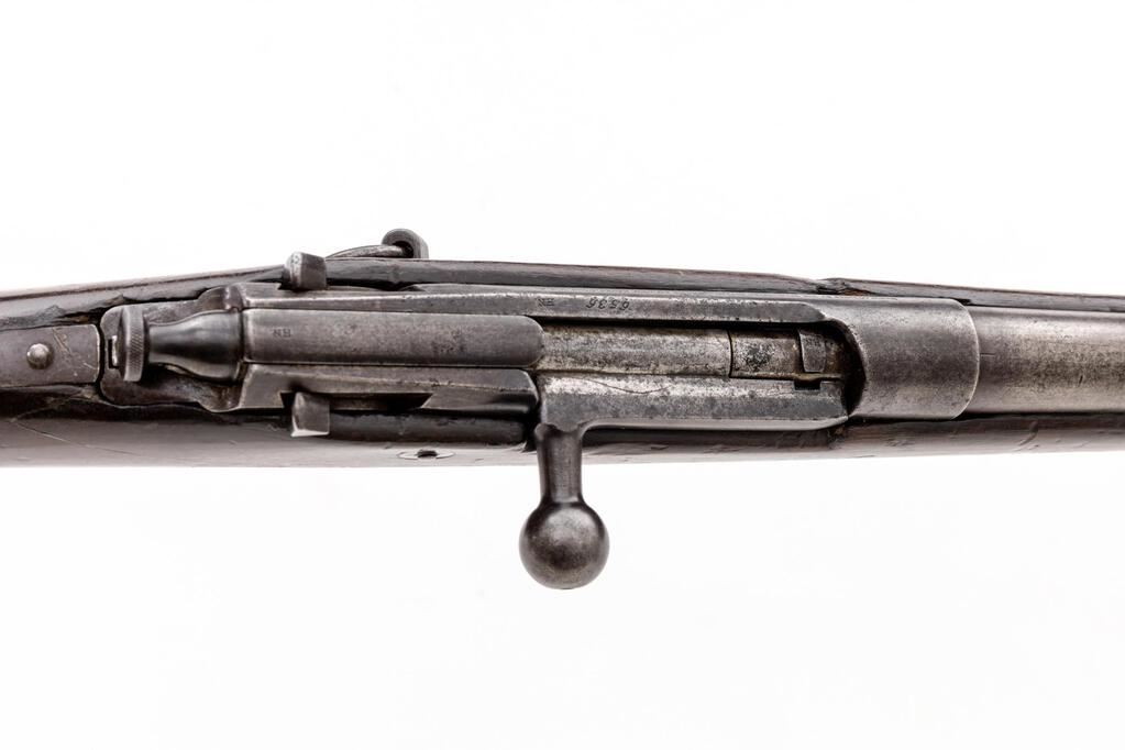 Antique Winchester-Hotchkiss Bolt Action Saddle-Ring Carbine, 2nd Type, #6536, .45-70 CF cal., 24" round barrel, pinned block-blade front and wind gauge rear sight; long receiver marked "6536" and "HN" at left rail, maker's name, address and 1860-1877 patent dates in 3 lines at left, has 7" sliding bolt with knurled rear knob, rear safety at top left, mag. cutoff at right. Oil-finished walnut halfstock has internal magazine, steel trigger guard and buttplate, nickeled nosecap with door to 2-pc. cleaning rod (present). Mfg'd early 1880s. Condition is good retaining traces of original blue, darkened case colors, fine edges and markings. Stock is sound and smooth with usual use marks (.625" wood loss at forend), 5.5" repaired crack at right-rear receiver. Bolt is smooth. action is crisp, bore shows moderate erosion, good rifling. Est.: $900-$1,200. (Antique)