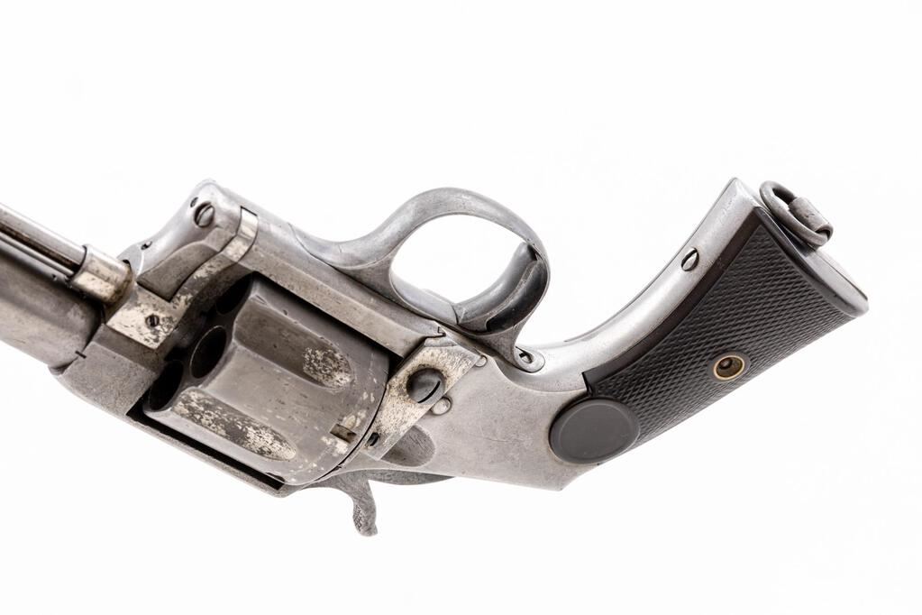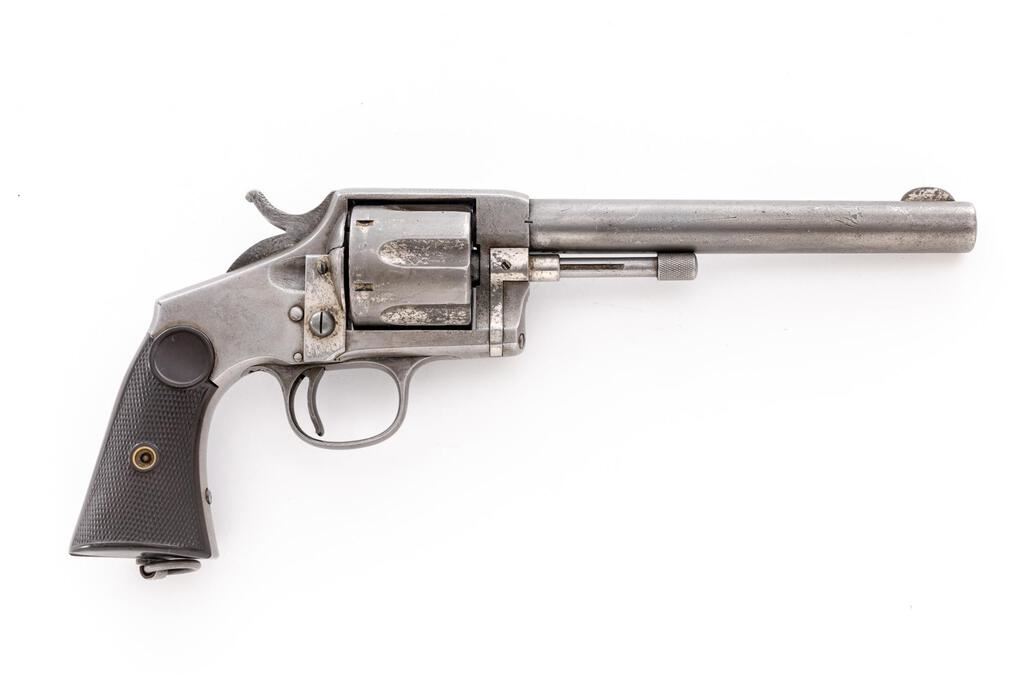 Hopkins & Allen "XL No. 8" Single Action Army Revolver, #105, .44-40 CF cal., 6.75" round barrel, fluted 6-shot cylinder, solid frame marked "Hopkins & Allen Mfg. Co./Pat. Mch 28, 71 May 27, 79" and "XL No. 8" on topstrap has left-hand release for sliding ejector rod, integral "saw-handle" straps with lanyard ring at butt, 2-pc. checkered hard rubber grips. Mfg'd late 1870s-early ?80s, in very small qty. Condition is good retaining traces of original finish else smooth gray gunmetal having occasional light erosion, sharp edges and markings. Grips are sound showing only light wear, tiny fleabite and .25" chip at left butt. Action does not hold cock, bore shows light erosion, fine rifling. Est.: $800-$1,200. (Antique)