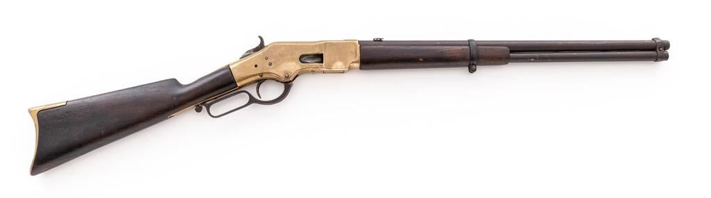 Frontier-Era Winchester Model 1866 "Yellow Boy" Saddle-Ring Carbine, 3rd Type, #102086, .44 CF cal., 20" round barrel, full-length magazine beneath retained by clamping band with integral front sight; distinctive brass receiver has removable sideplates, brass cartridge lifter. Oil-finished walnut forend retained by a single clamping band, matching buttstock with brass crescent buttplate. Mfg'd ca. 1872 in .44 rimfire cal. with blued barrel/mag, case hardened lever/hammer, bright brass; later altered to centerfire, perhaps in Mexico/South America. Condition is good retaining no original finish or barrel markings, being dark brown steel with overall light peppering; cleaned brass shows light toning. Stocks are sound showing wear and light marks, 3" wood repairs at both sides of top tang and toe of buttstock, which appears to have been spliced in two halves and fits a bit loose. Rear sight is a replacement, saddle ring/stud are missing. Action is crisp, bore shows overall dark etching, good rifling. Est.: $3,500-$4,500. (Antique)