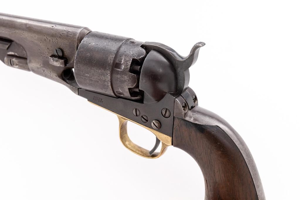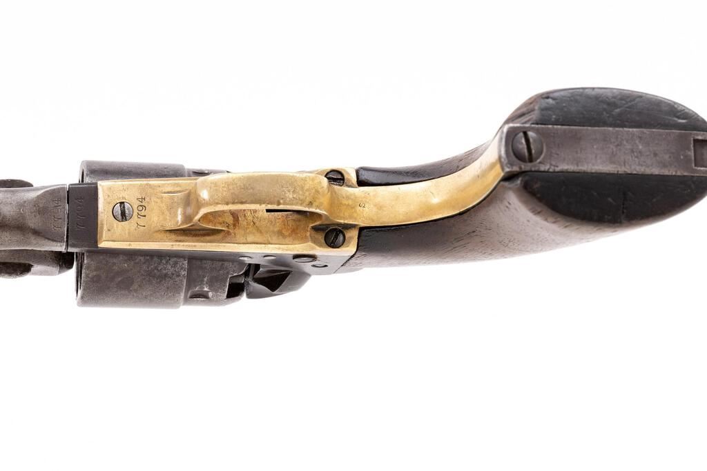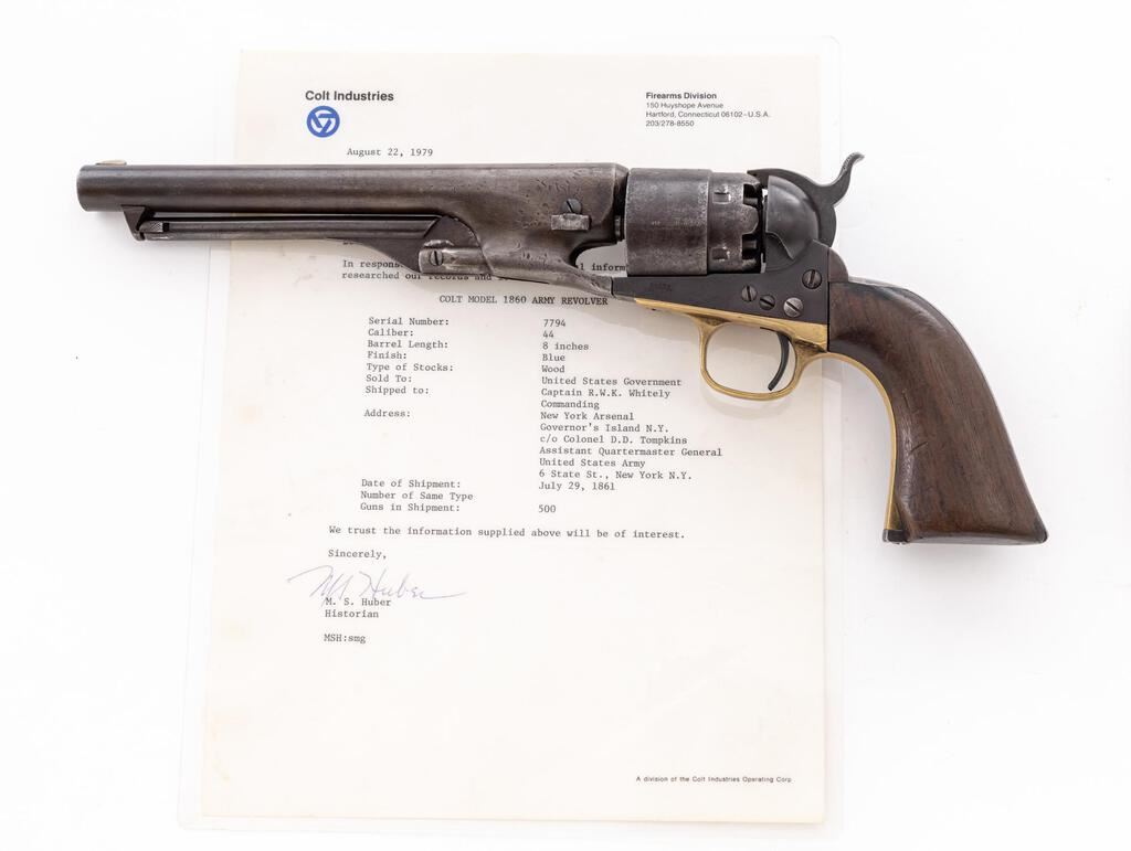 Early Colt Model 1860 Army Single Action Percussion Revolver, #7794, .44 cal., 8" barrel with German silver blade front and fixed rear sights, unfluted 6-shot cylinder, blue and case hardened finish with iron rear and brass front straps, one-piece smooth walnut grips. Mfg'd 1861 1861. Revolver is in good overall condition with an even dark patina. Barrel show areas of light pinprick pitting with a slightly reduced front sight and a good legible barrel address. There is considerable knackering around the wedge channel on both sides. Frame is a dark brown patina with a legible "COLTS PATENT" on the left side. Gun is cut for stock with a desirable 4-screw frame. Cylinder is a dark brown patina with intermittent light to moderate pitting around the entire diameter; there is no visible cylinder scene remaining with a legible Colt Patent line and serial number. There is a capping groove on the right side. Revolver shows all matching visible serial numbers, except the wedge, which is a mismatched period replacement. Safety pins are hammered flat while the nipples are intact and strong. Rear grip strap is iron and the front strap and trigger guard are brass. Front strap and trigger guard have been cleaned. Grips are good with no visible cartouches noted. There are chips at the toes of both panels and small mars consistent with service use. Action works well and the timing is good; bore is fair with roughness, light intermittent pitting, and visible rifling. Lot includes a Colt factory letter confirming all features and indicating the revolver was shipped to the U.S. Government, Capt. R.W.K. Whitely Commanding New York Arsenal, Governor's Island, N.Y. c/o Colonel D.D. Tompkins Assistant Quartermaster General U.S. Army 6 State St., New York, N.Y. July 29, 1861, with 500 guns in shipment. This is an honest early Civil War era Colt shipped the week after Bull Run. Est.: $2,000-$2,500. (Antique)