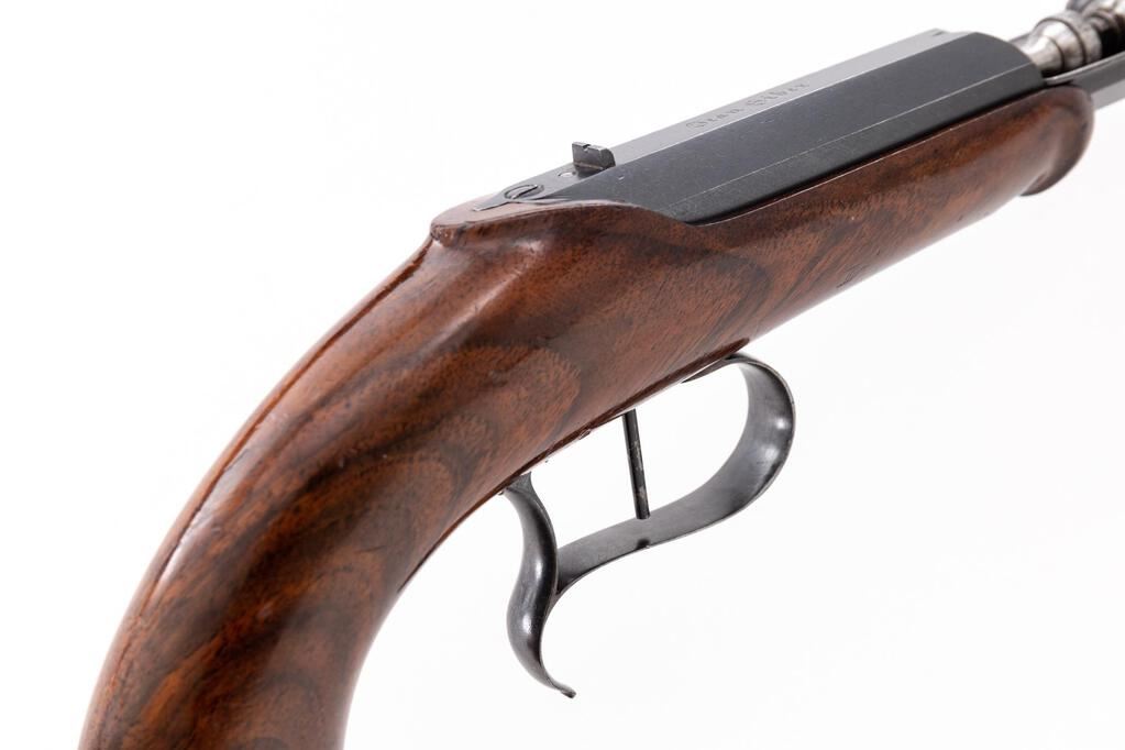 Antique Swiss Single-Shot Salon Pistol, by Jean Siber of Lausanne, NVSN, 4mm, blued 3.5" octagonal barrel made integral with 4" breech (marked "Jean Siber",) has a 1" opening for sliding striker that is manually thumb-cocked, then capped and fired using the conventional trigger. Halfstock of varnished walnut has bag grip, spurred trigger guard, and Schnabel nose. Condition is excellent retaining approx. 98% deep blue, sharp edges and markings. Stock shows minor handling marks, lovely grain, color, and most original varnish. Action is crisp, bore is clean having fine spiral rifling. Siber and his family were Swiss watchmakers, and their quality and detail show. Est.: $800-$1,100. (Antique)