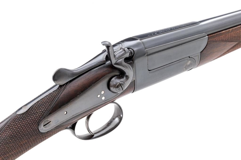 British Cowels & Dunn 28 Gauge Single Barrel Shotgun, #90774, 28 ga., 27" barrel, 2.5" chamber, blued finish, rear of barrel engraved "Cowels & Dunn, Sydney N.S.W., Made in England", receiver has Birmingham proof marks, "28c" in diamond, "nitro proof 3/8", and marked "choke", all visible numbers matching, outside rebounding hammer, island lock, extractor, silver bead front sight, straight grip checkered walnut stock with horn buttplate, 14.25" LOP (14" to original wood), checkered walnut forend with black horn end cap, and silver oval roundel with engraved letters "JS" on lower edge of buttstock. No decorative engraving, just thin border lines on the receiver and lock. Condition is very good retaining approx. 98% of a proper refinished bluing, showing only minor wear to the right side of the receiver at the hinge pin and thinning of the bluing on the lock. Action is tight and functions properly; bore is mostly bright, with light pitting around the forcing cone, and there is a small area of roughness and pitting about 7" from the muzzle. Stock shows a light oil refinish, still showing minor dings, light depressions, and scratches; checkering appears to have been freshened up, with sharp diamonds. Horn buttplate shows damage and small losses from insects. All the screws are properly indexed with clean slots. A neat little shotgun! Est.: $1,200-$1,500. (Antique)