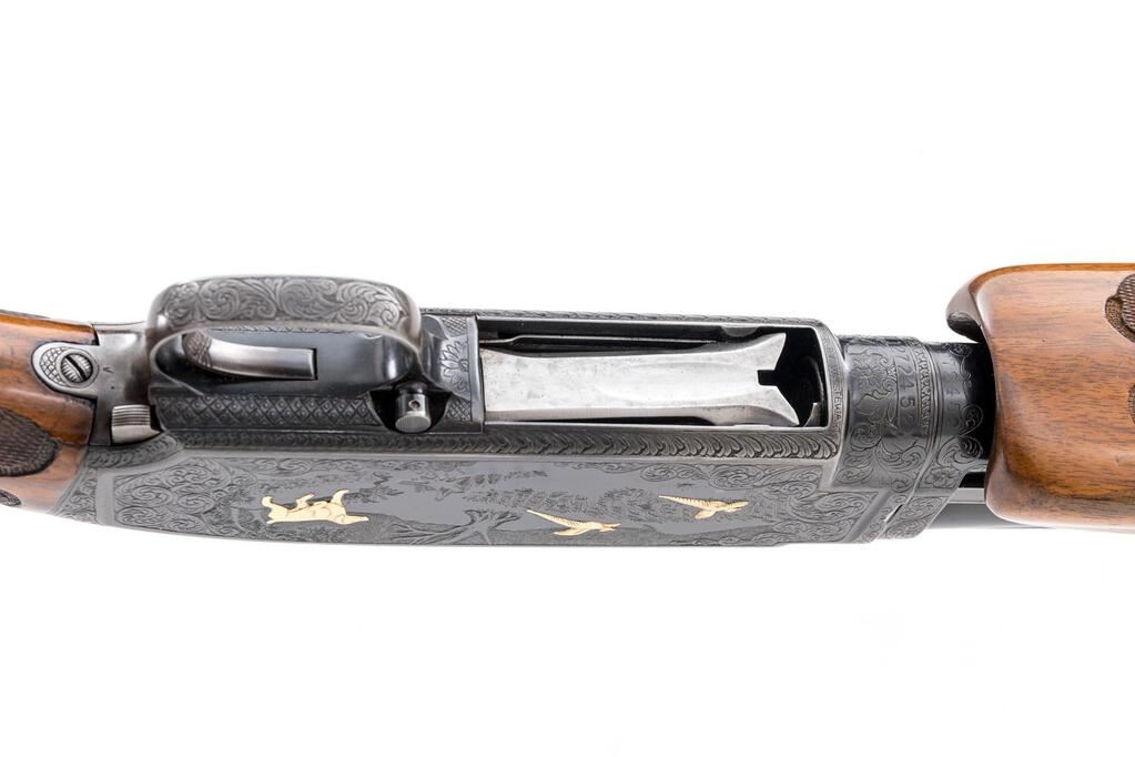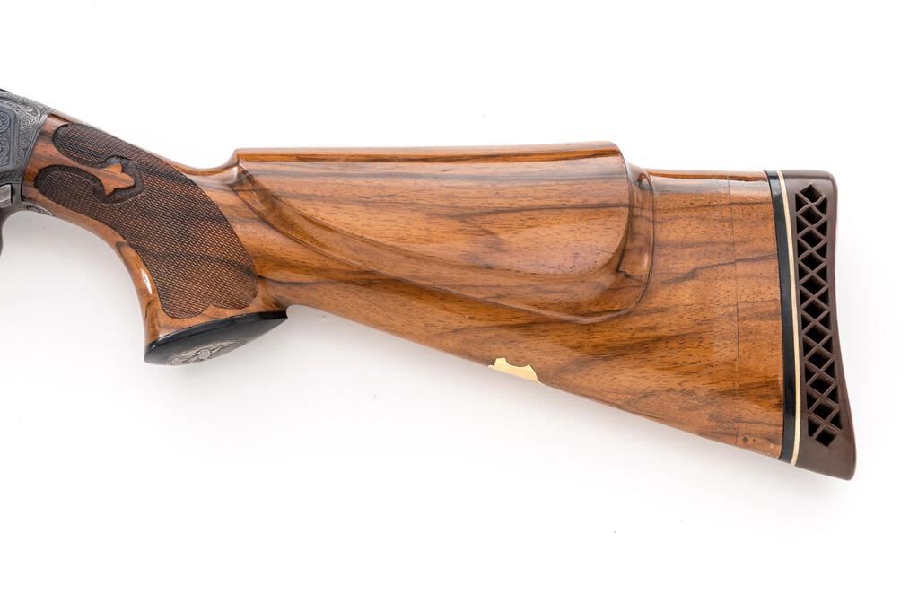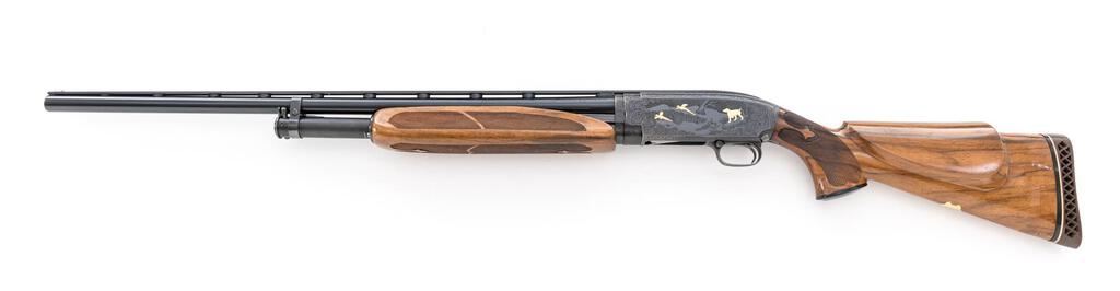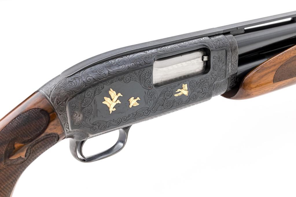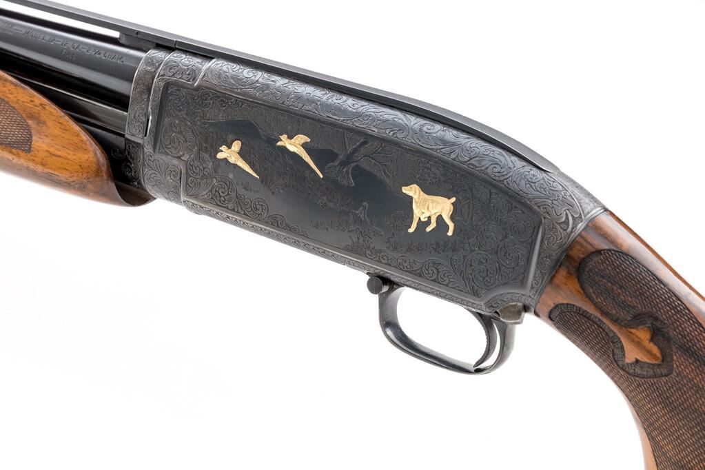 Upgraded Winchester Model 12 Slide-Action Trap Gun, #1272452. 12 ga. 28" barrel has a wide ..." Simmons rib mounted, which extends to the rear of the receiver, a 2-3/4" chamber, target beads, and is choked Full. The action is standard Model 12 but has engine-turned bolt and lifter. The receiver has been extensively engraved after market by W. Stewart, including hunting scenes on both sides surrounded by floral scrolls with gold inlaid ducks, pheasant, and pointing dog. The new full beavertail forend and pistol grip Monte Carlo buttstock are of "C" Grade light walnut, gloss finished, with fleur-de-lis patterns and checkering at 22 LPI, custom grip cap with duck engraved in pewter, and a Pachmayr Whiteline Trap Model recoil pad. Stock dimensions are 14-1/2"x1-3/8"x2". Originally mfg'd 1951. Condition is very good as upgraded, with some handling marks to wood, carry wear to bottom of receiver, and moderate wear to action, which closes tight and functions correctly; bore is bright. Est.: $800-$1,200. (C&R)