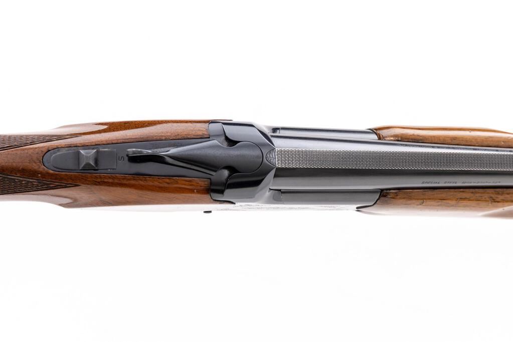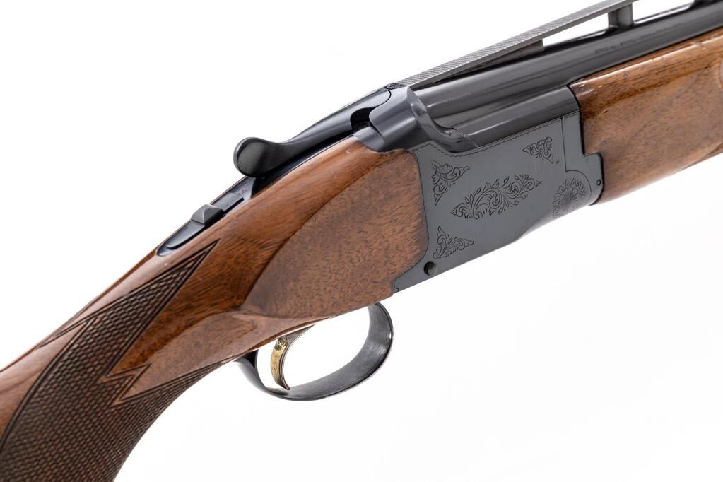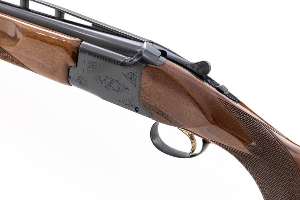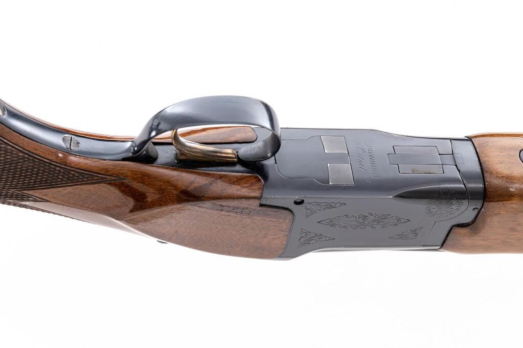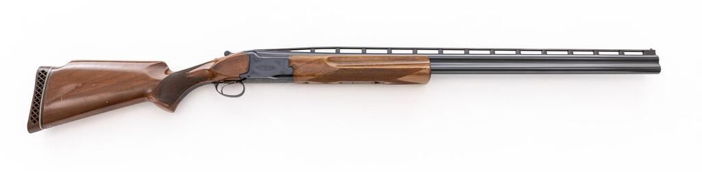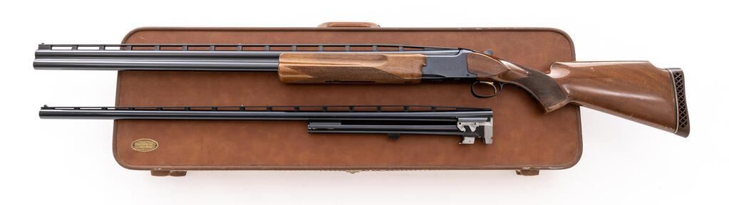 Browning Citori Grade 1 Two-Barrel Trap Combination Set, #05765RN143. The 12 ga. 32" over/under high vent rib barrels have target beads, 2-3/4" chambers, and are choked Mod./Full; the 12 ga. 34" top single barrel has the same high vent rib, target beads, a 2-3/4" chamber, and is choked Full. Both barrels are serial numbered to the receiver. The Citori boxlock action features a single selective inertia trigger, non-automatic safety, and auto ejectors; the receiver is lightly engraved. The finger-groove beavertail forend and Monte Carlo pistol grip buttstock are of straight-grain high-gloss finished walnut, with thorough checkering and original Browning Pachmayr Whiteline Trap Model recoil pad. Stock dimensions are 14-1/2"x1-1/2"x2". Gun is contained in original Browning two-barrel hard case. Mfg'd by Miroku in Japan for Browning in 1979. Condition is good to very good with numerous handling marks to wood, carry and operating wear to blued edges, and noticeable operating wear to action, which still locks tight and operates correctly; all bores are bright. Est.: $800-$1,200. (Modern)