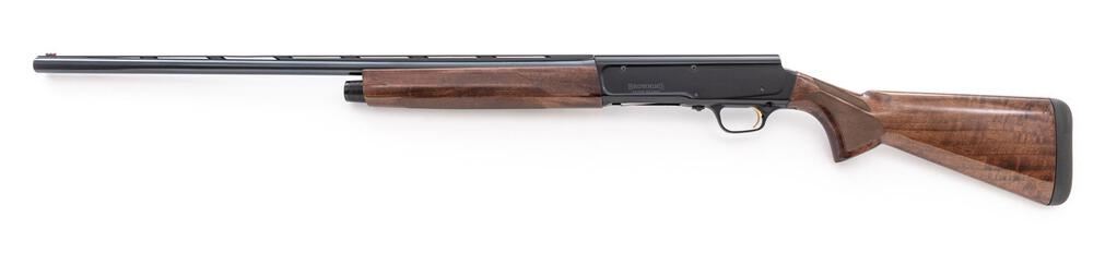 Browning New Design Auto-5 "Sweet Sixteen" Model Semi-Automatic Shotgun, #116ZT14158. 16 ga. 28" vent rib barrel has target beads, 2-3/4" chamber, and is fitted for Invector choke tubes (IC installed). The action is gas operated, similar to the Benelli system; the receiver is dark anodized alloy with Browning logos. The slender forend and full pistol grip buttstock are high-gloss finished, dark "B" Grade walnut, with distinctive checkering, A5 grip cap, and "Inflex" recoil pad. Stock dimensions are 14-3/8"x1-7/8"x2-1/8". Mfg'd 2016. Condition is excellent, approx. 95%, with little wear to action, which functions correctly, and there are almost no marks to the wood. Bore is bright. A very nice, fast-handling field gun. Est.: $1,000-$1,200. (Modern)
