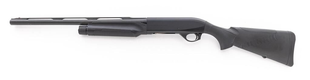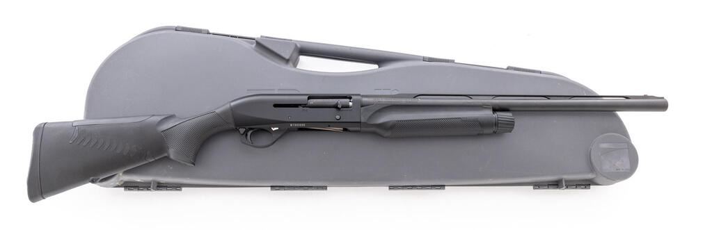 Benelli M2 "3 Gun" Model Semi-Automatic Shotgun, #M789369S. 12 ga. 21" vent rib barrel has 3" chamber, Hi-Viz front sight, and is fitted for Benelli Crio chokes (5 included). The action is the Benelli inertia system, which handles 2-3/4" and 3" shells interchangeably. The alloy receiver is anodized flat black, to match barrel and stocks. Finger-groove forestock and pistol grip buttstock are black synthetic, with recoil reducing buttstock features including special butt pad. Stock dimensions are 14-1/2"x1-1/2"x2". Includes Benelli hard case with tubes, wrench, lube, mag plug, and stock shims. Mfg'd 2012. Condition is very good, approx. 90%+, showing little use to action, which functions correctly; bore is mirror bright. Est.: $1,200-$1,500. (Modern)